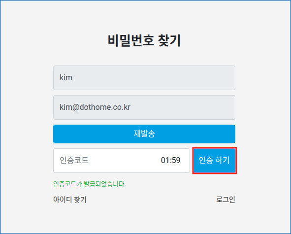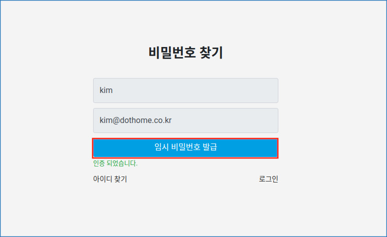 회원정보의 이메일로 인증코드 발급 -> 인증코드 입력 -> 임시비밀번호 발급 순서로 진행됩니다.