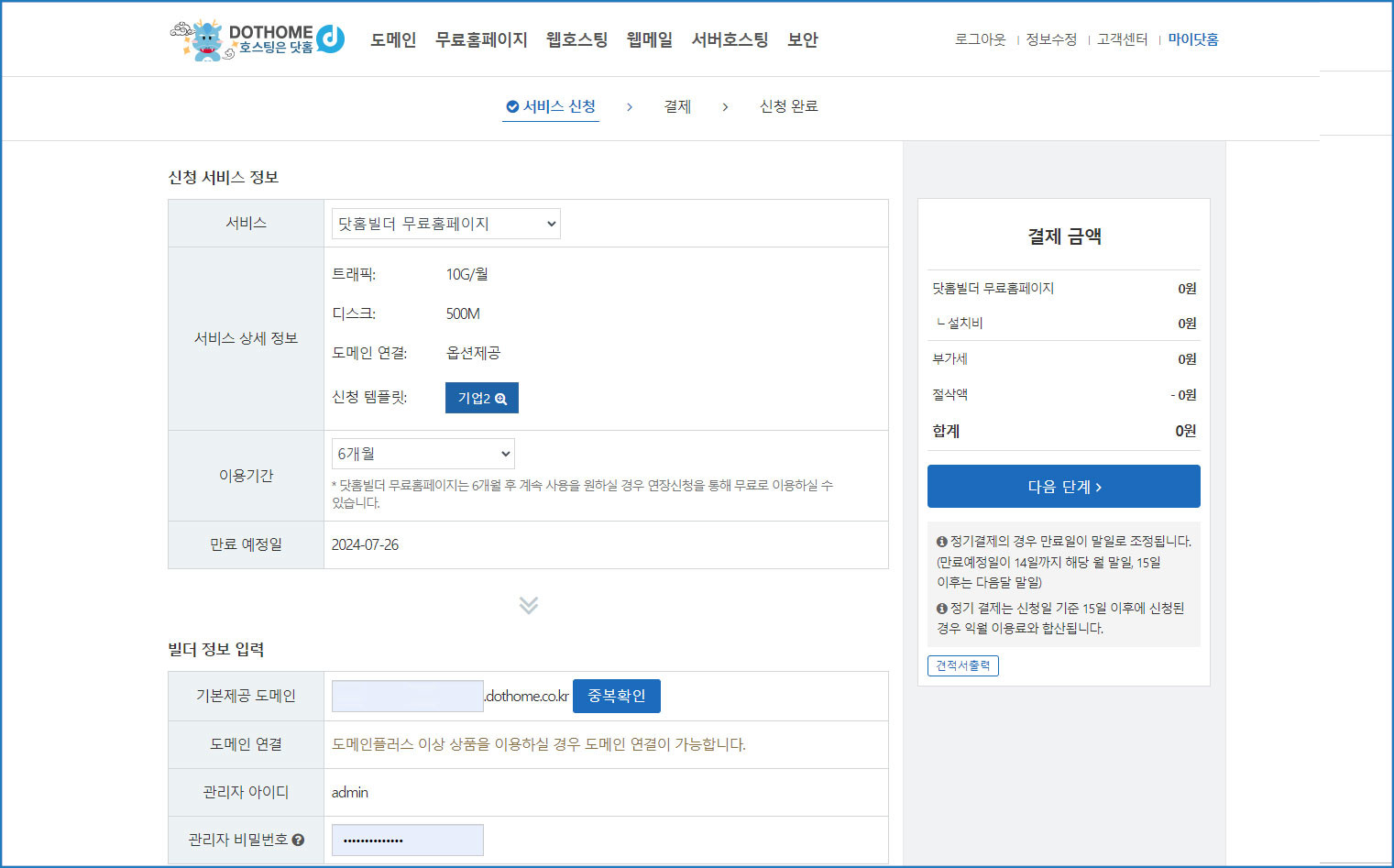서비스 신청페이지에서 각 항목별로 내용을 작성하신 뒤 오른쪽 견적서 하단의 [다음 단계] 버튼을 클릭합니다.