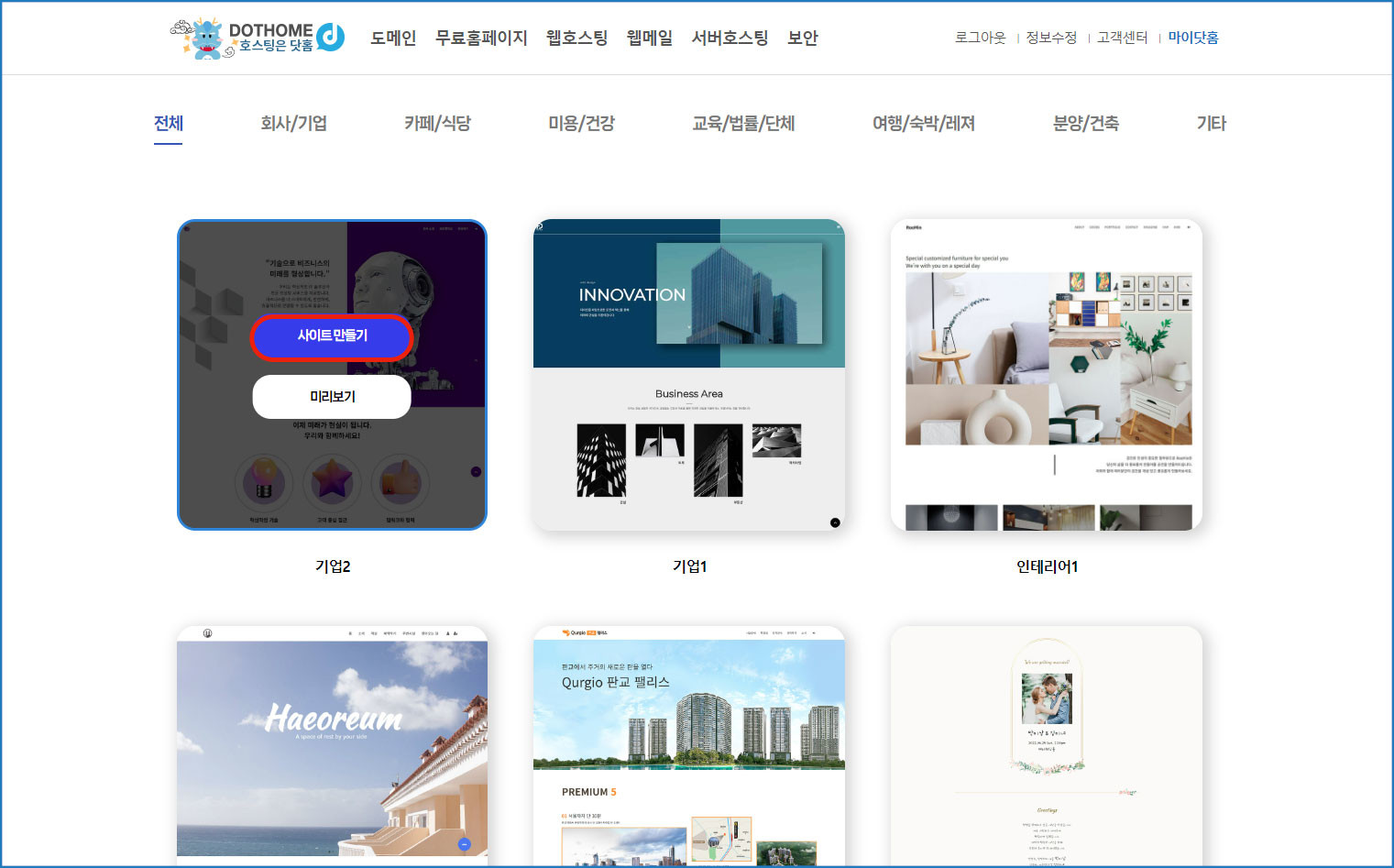 닷홈에서 제공하는 전문 디자이너가 제작한 템플릿들 중 원하시는 템플릿을 선택하셔서 [사이트 만들기]를 클릭하시면 서비스 신청페이지로 이동합니다.