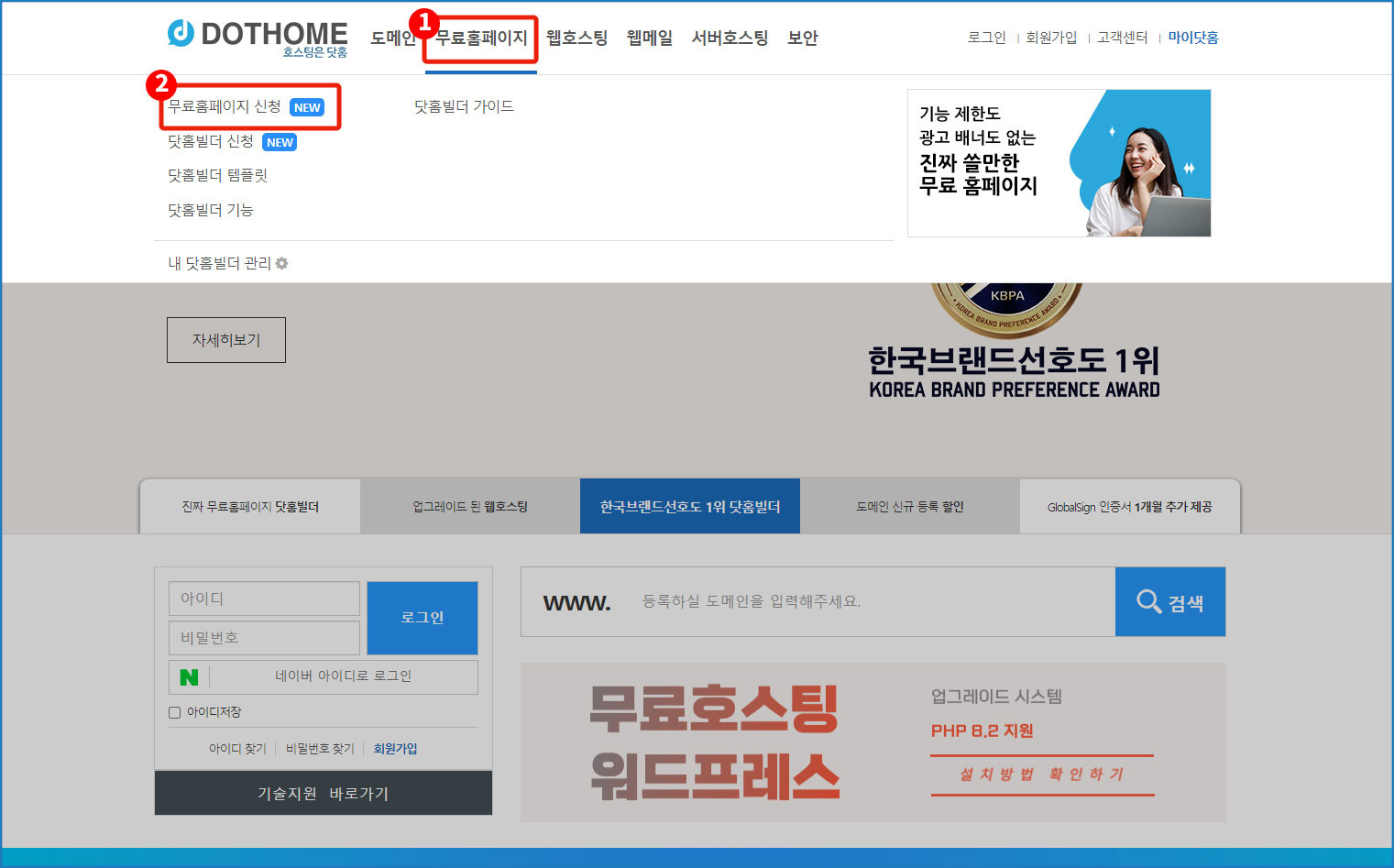메뉴에서 무료홈페이지 > 무료홈페이지 신청을 클릭합니다.