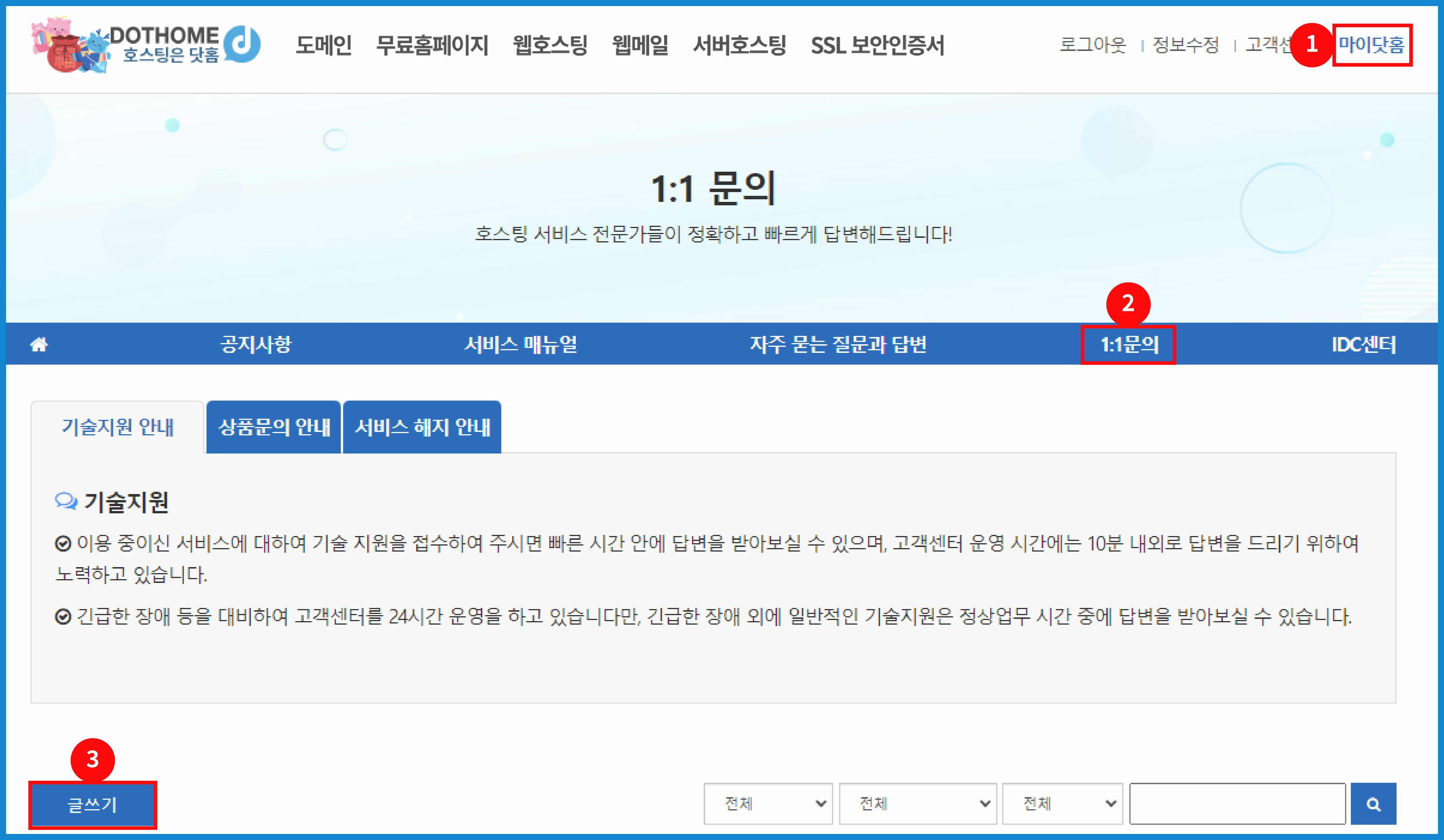 1. 닷홈에 로그인 하신 후 상단 메뉴 중 [고객센터] - [1:1문의] - [글쓰기]를 클릭합니다.