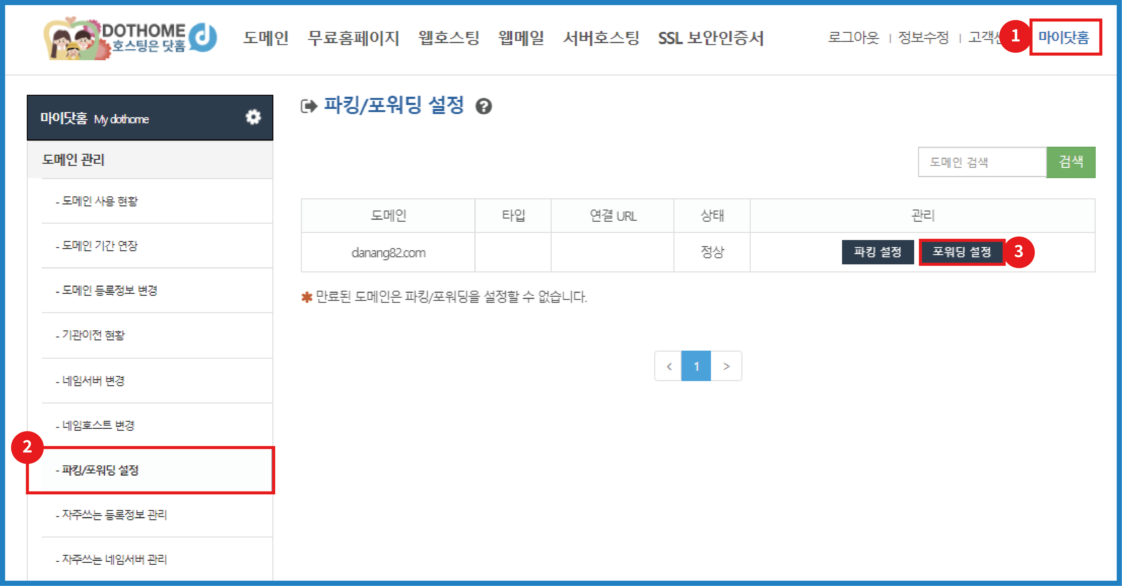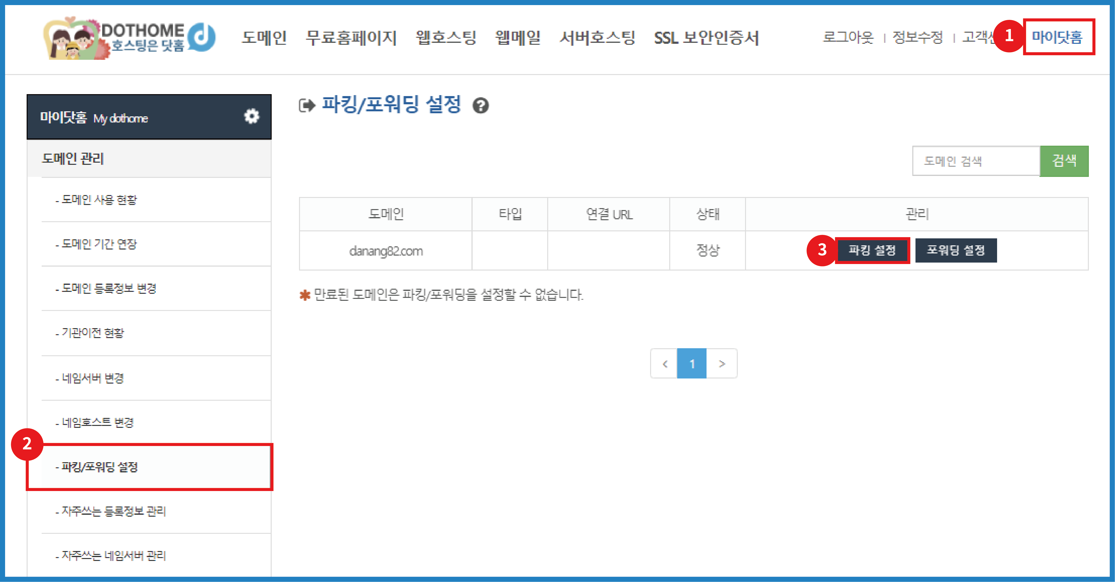 도메인 파킹 서비스는 [마이닷홈] - [도메인 관리] - [파킹/포워딩 설정]에서 가능합니다.
