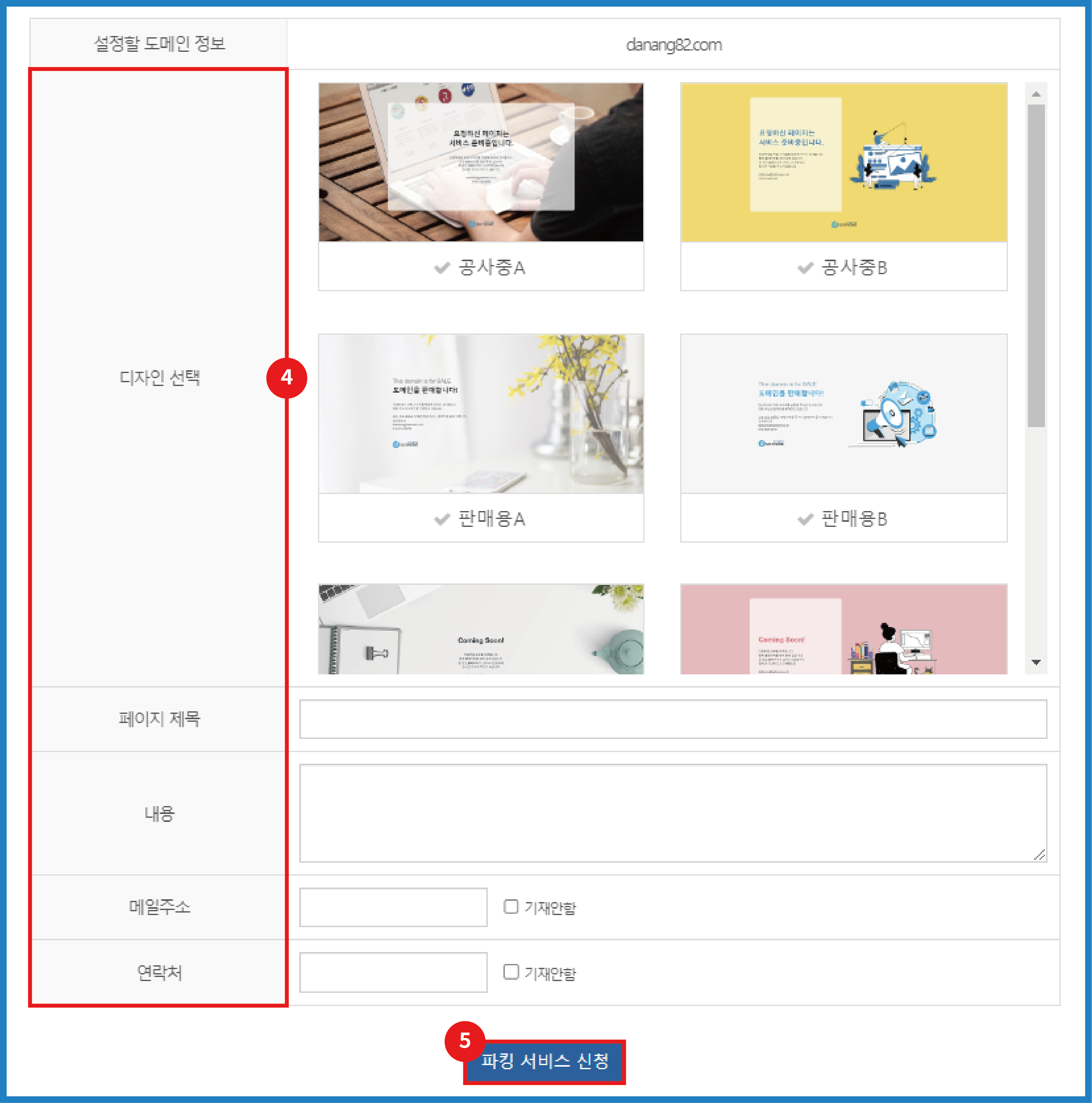 파킹 설정 화면에서 디자인을 선택하고 페이지 제목과, 내용을 입력합니다.[파킹 서비스 신청] 버튼을 클릭합니다.