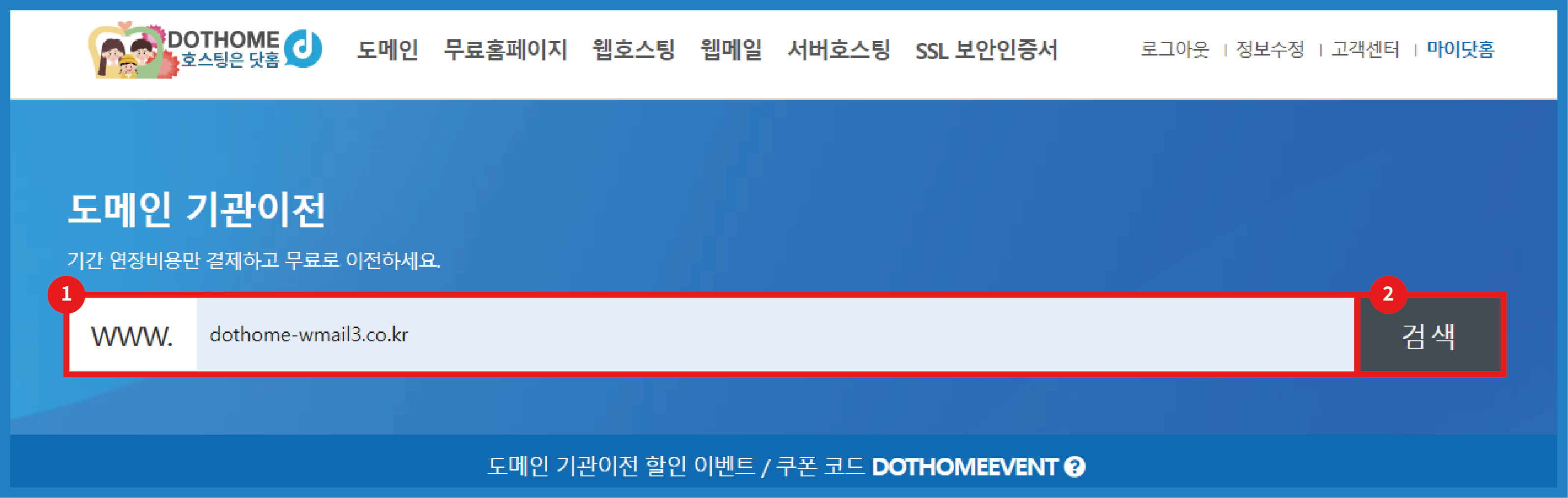 닷홈 메뉴에서 [도메인]-[도메인 기관이전] 버튼을 눌러줍니다. 기관이전 할 도메인을 검색하여 기관이전이 가능한 도메인 인지 확인 후,