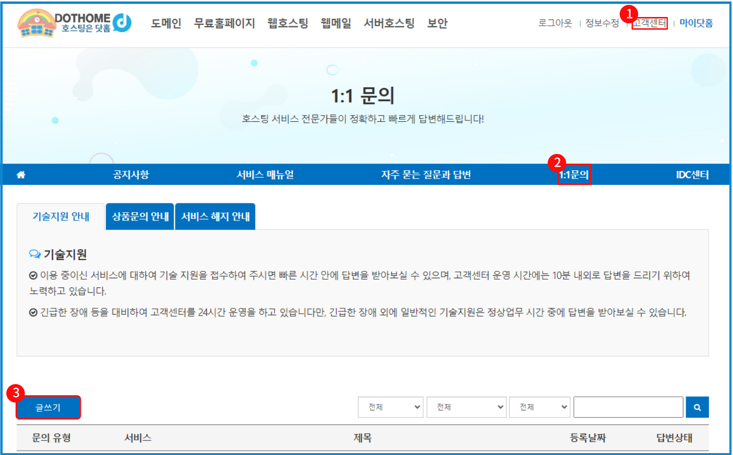 닷홈 홈페이지 상단 ①[고객센터]-②[1:1 문의]-③[글쓰기]버튼을 눌러주세요.