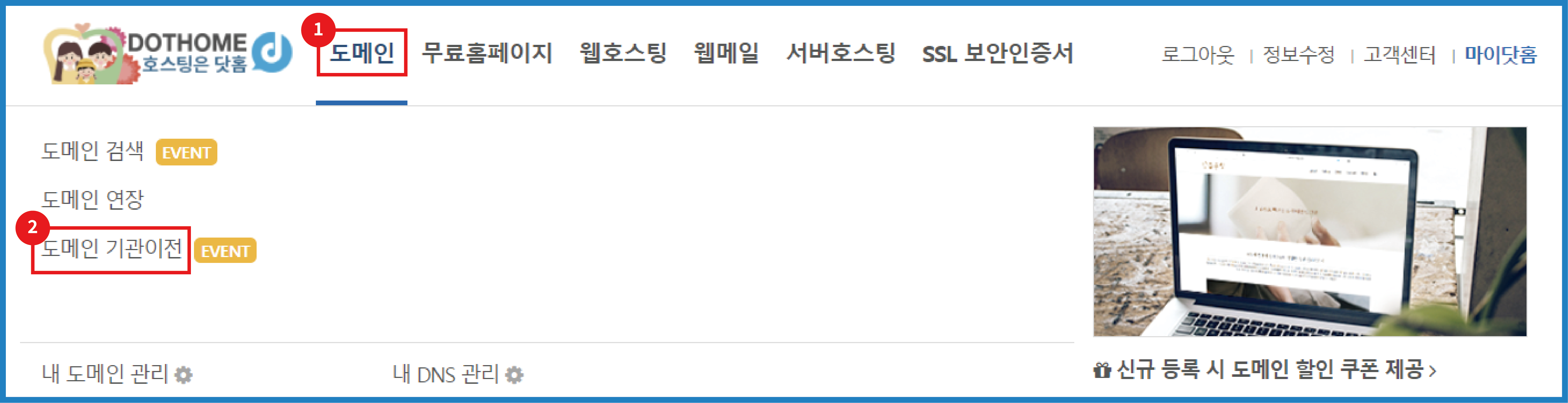 닷홈 메뉴에서 ①[도메인]-②[도메인 기관이전] 버튼을 눌러줍니다.