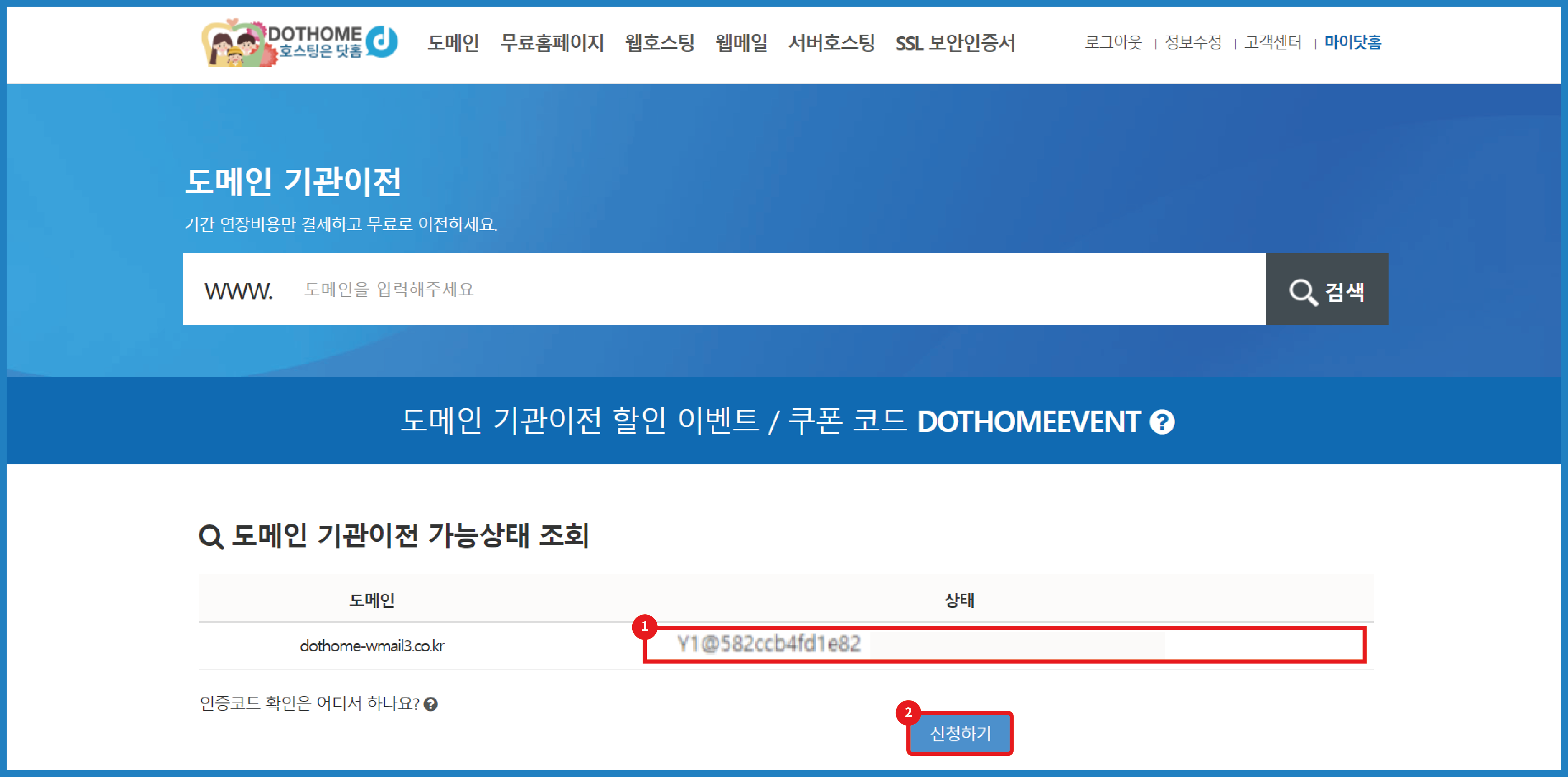가능한 도메인이면, "상태" 부분에 기존 기관에서 받은 ①인증코드를 붙여 넣고 ②[신청하기] 버튼을 눌러주면 기관이전 신청이 완료됩니다.