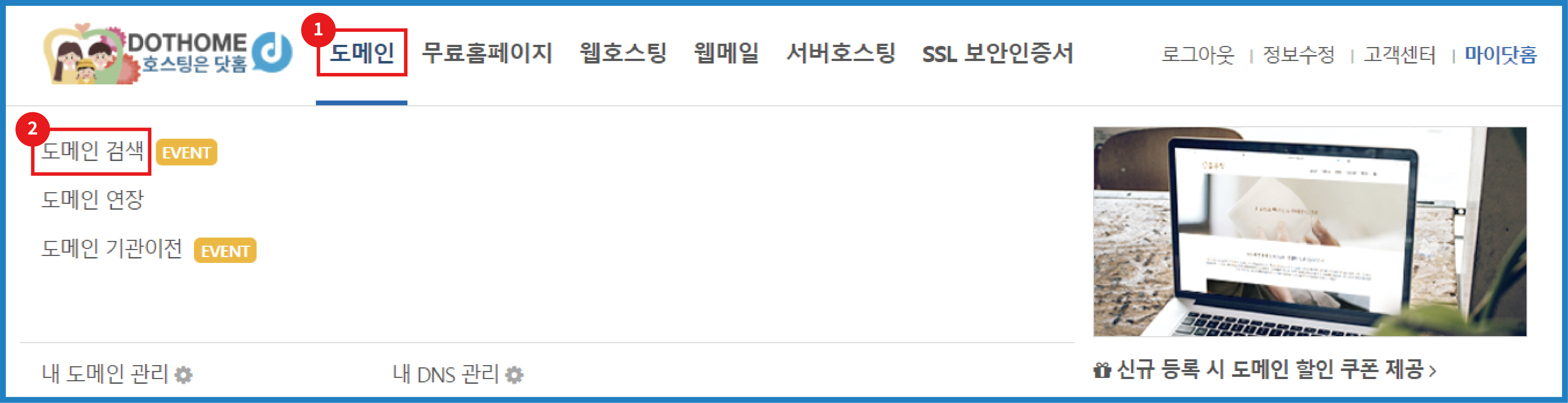 닷홈 홈페이지 상단메뉴의 ①[도메인] - ➁[도메인 검색]을 눌러줍니다.