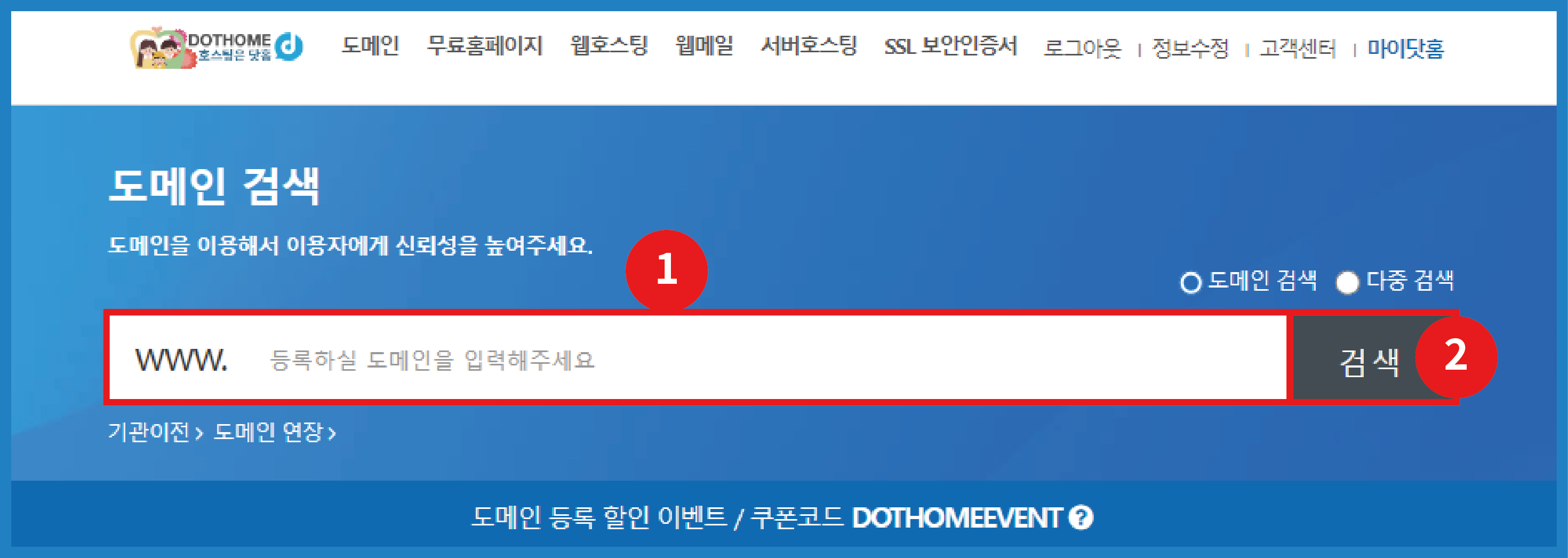 ①도메인 입력창에 등록할 도메인을 입력하여 ②검색 버튼을 눌러 신청 가능 여부를 확인합니다.