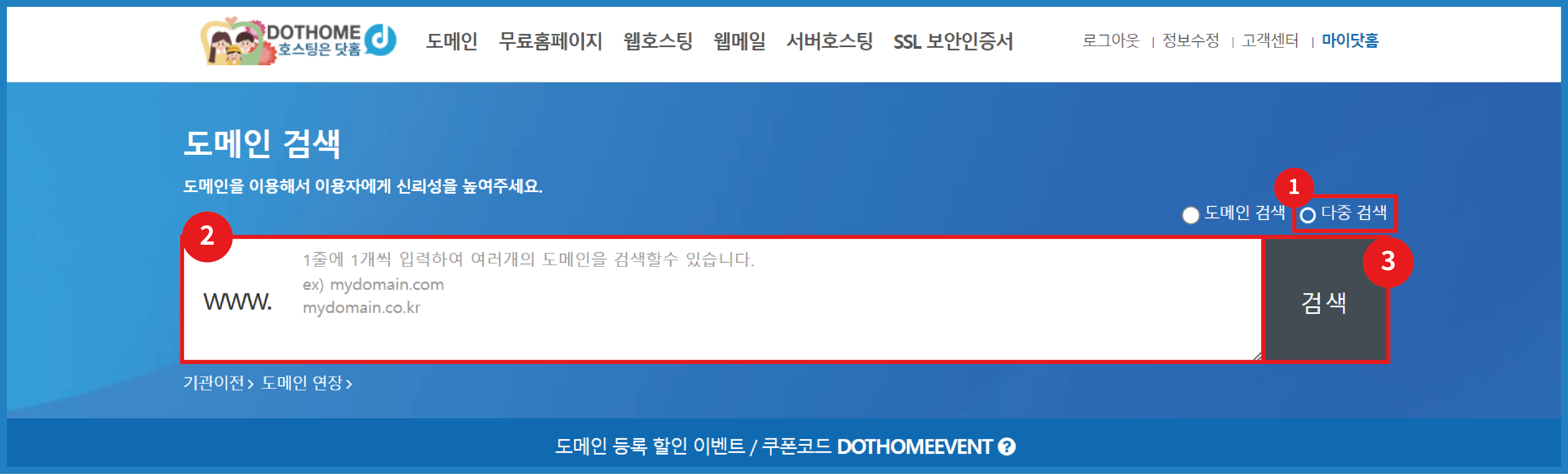 또한, 여러 도메인을 검색하실 때는 우측 ③[검색]버튼 위에 ①[다중 검색]을 눌러서 여러 개의 도메인을 엔터로 구분하여 한 번에 검색하실 수 있습니다.