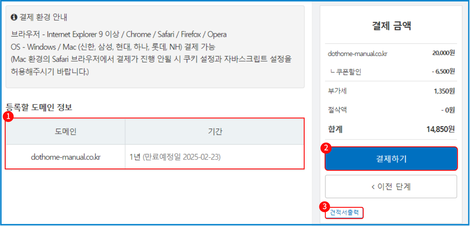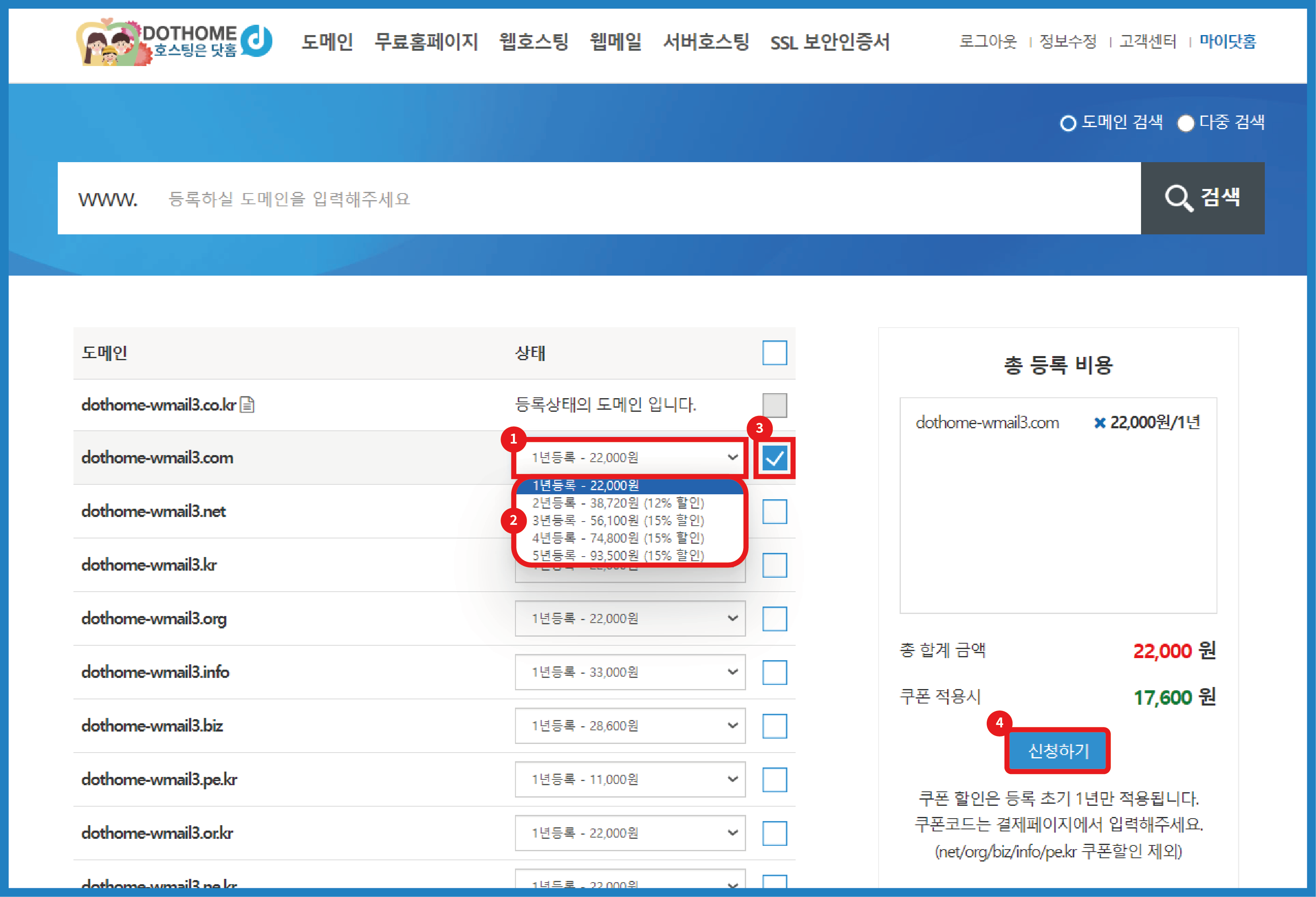 등록할 도메인 정보를 확인하시고 쿠폰 정보도 적용해주세요.