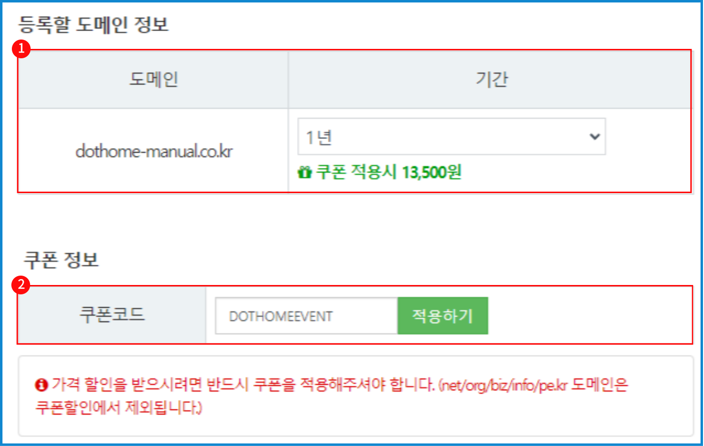 (net/org/biz/info/pe.kr 도메인은 쿠폰할인에서 제외됩니다.)