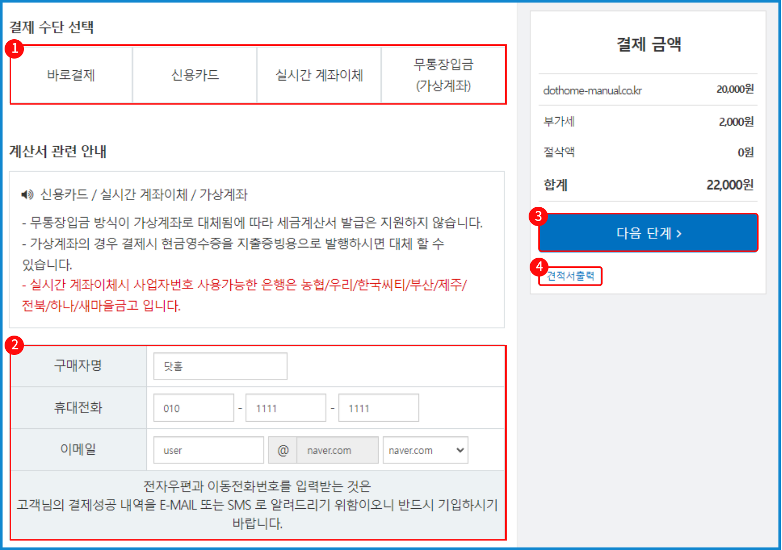 결제 수단 선택 및 구매자 정보 입력을 마쳤다면 ③ [다음단계] 버튼을 눌러주세요.