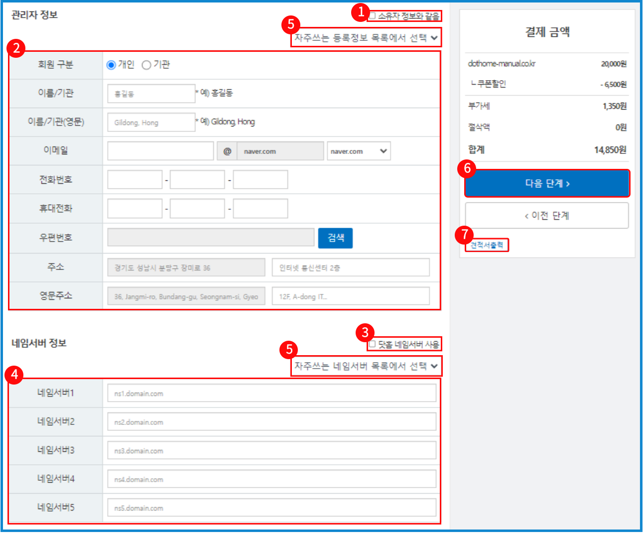 도메인 소유자 정보를 입력합니다. 소유자 이메일이나 정보를 통해 도메인의 관리나 인증이 진행될수 있으니 정확하게 입력주시기 바립니다.
