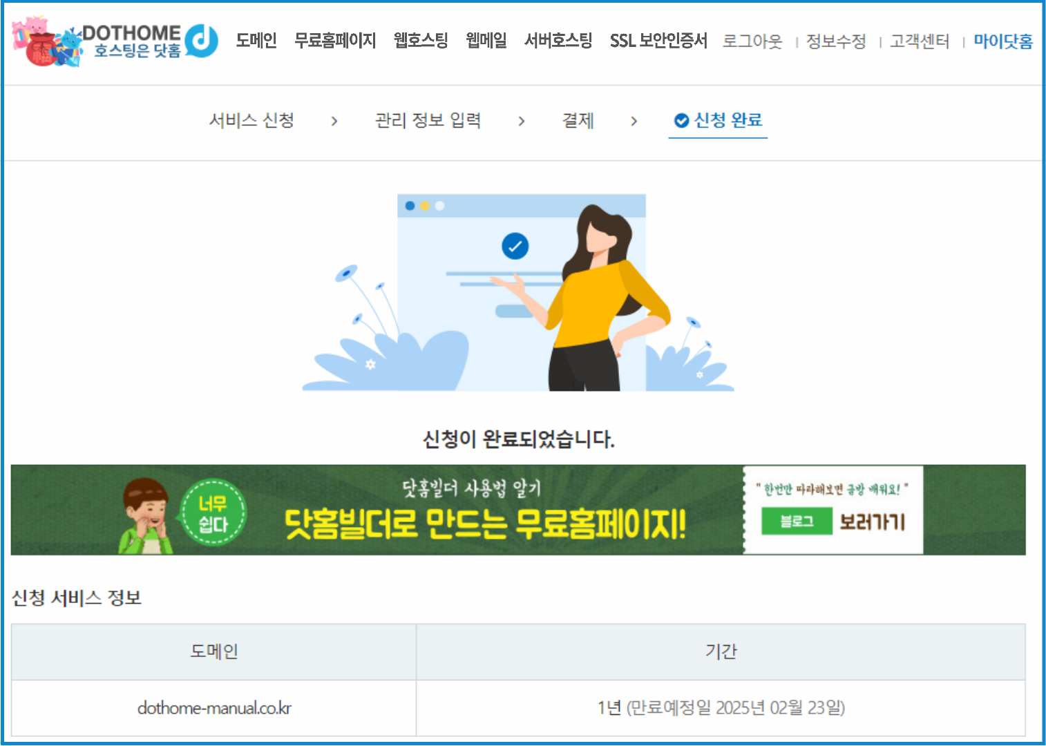 신청하신 도메인 정보는 [마이닷홈]-[도메인 관리]-[도메인 관리]에서 확인이 가능합니다.