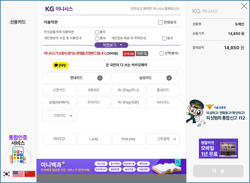 [도메인 / 도메인 등록 / 결제하기 버튼 / 이니시스 결제 창 화면]