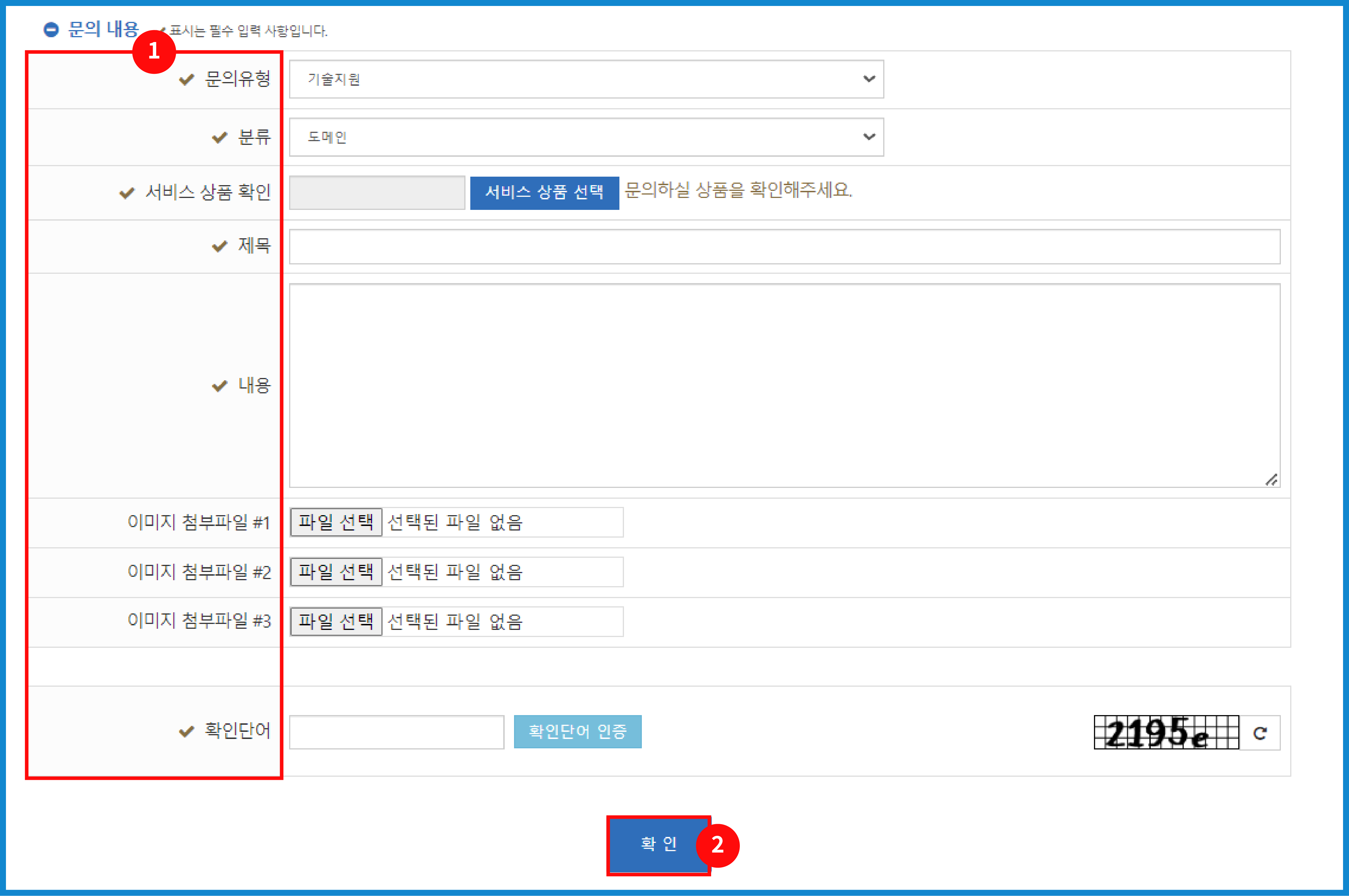 아래 표를 참고하여 ①문의 내용을 작성하신 뒤 ②[확인] 버튼을 눌러주세요.