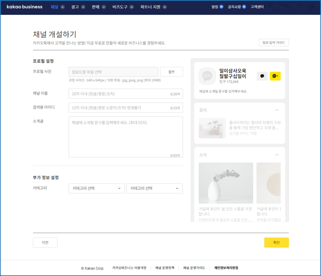 [카카오톡 채널 개설하기 화면]