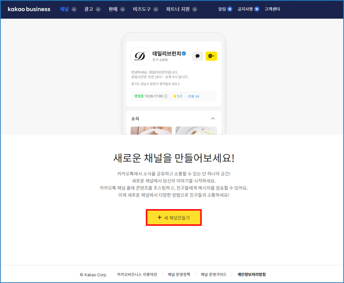 [카카오톡 채널 세 채널만들기 버튼]