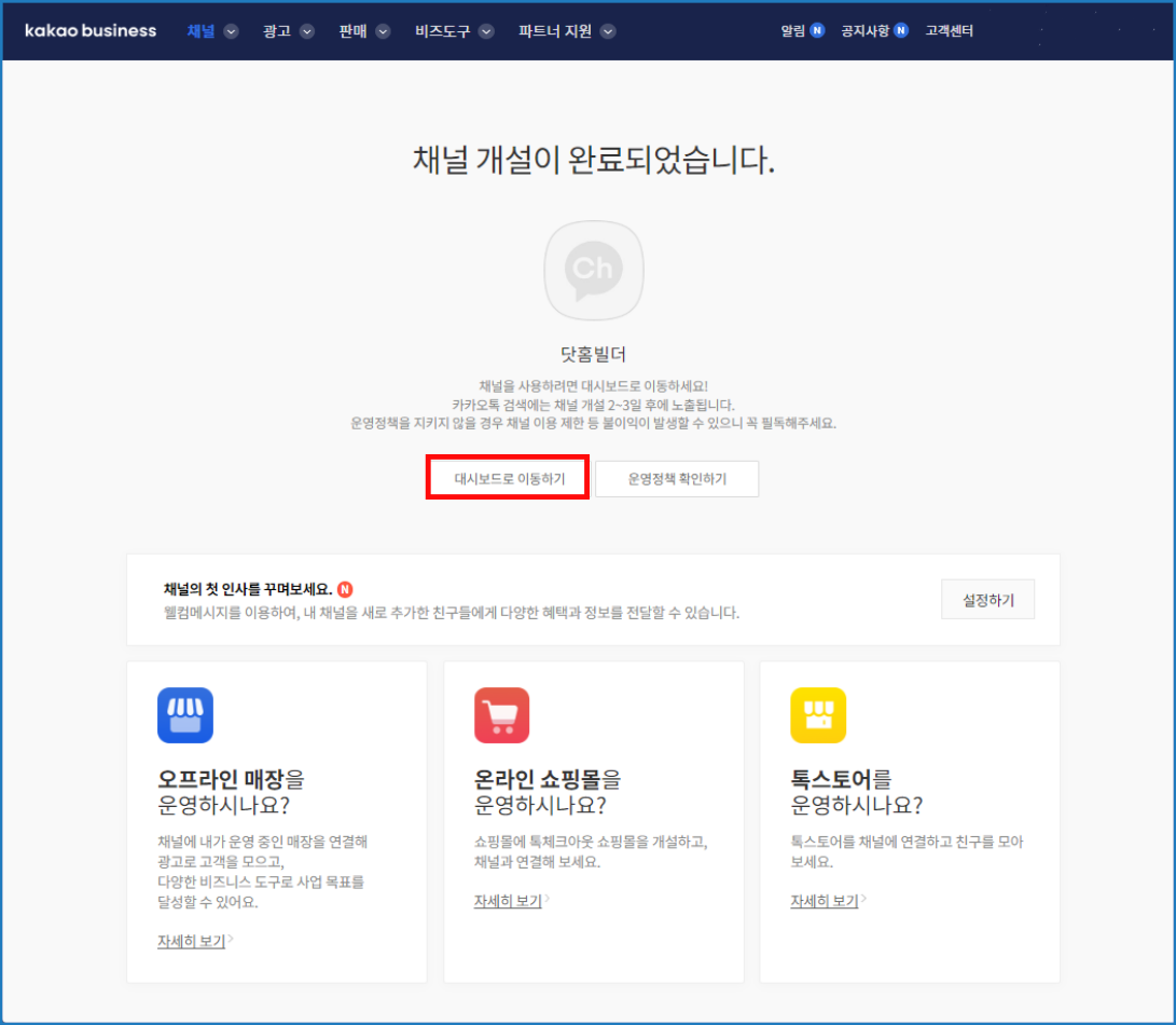 이러면 채널이 생성된거에요. [대쉬보드로 이동하기]를 클릭해주세요.