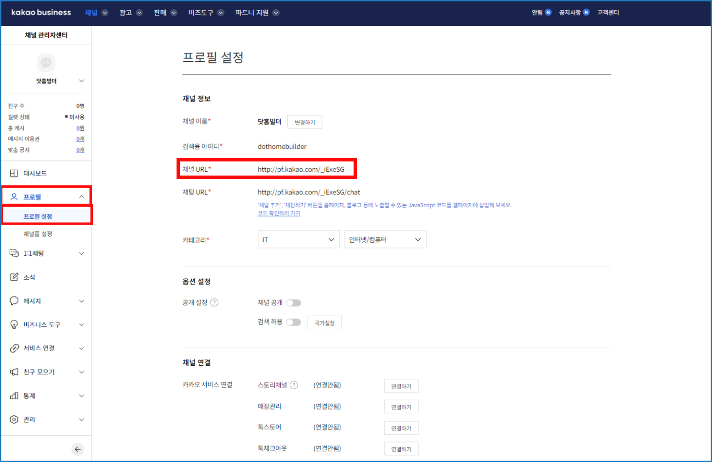 [닷홈빌더 관리자 카카오톡 채널 연동 설정 화면]