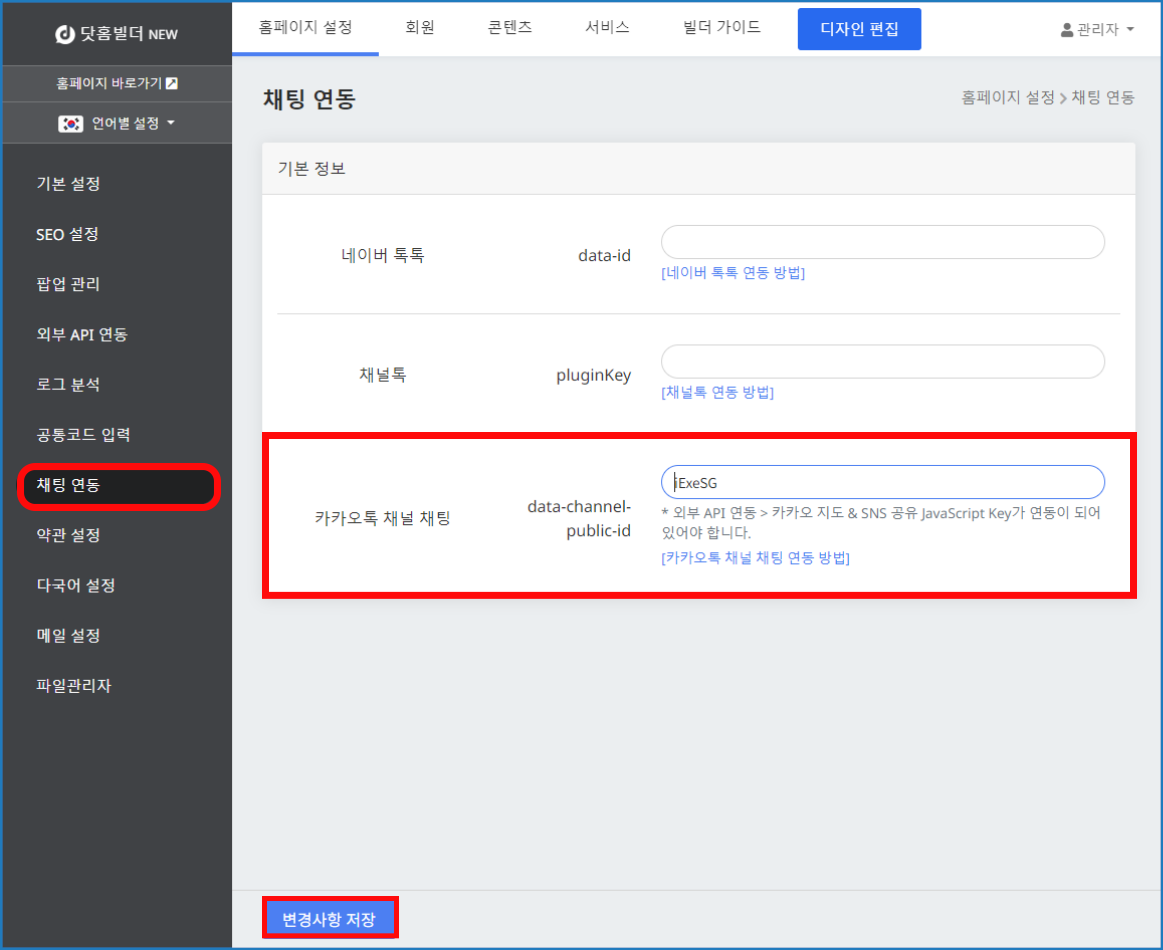 닷홈 빌더 관리자 페이지-[홈페이지 설정]-[채팅 연동]-[카카오톡 채널 채팅] 입력창에 복사했던 정보를 붙여 넣고,[변경사항 저장]하면 채널 채팅 연동 완료