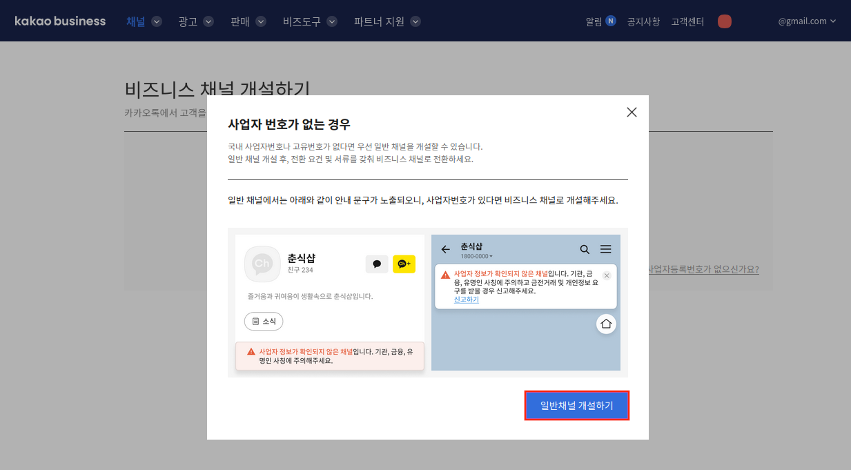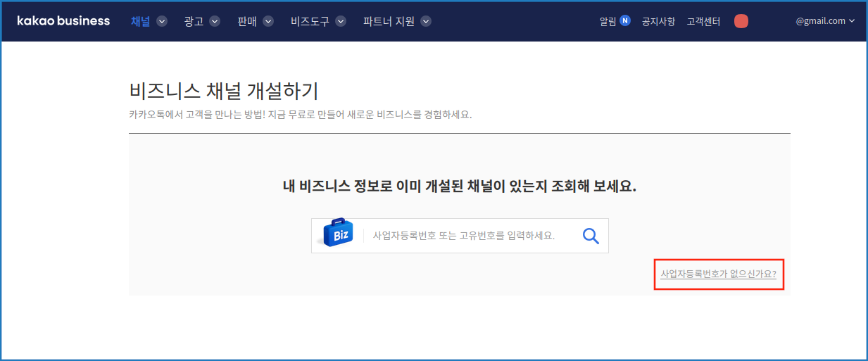 사업자등록번호가 없는 경우 일반채널 개설이 가능합니다.