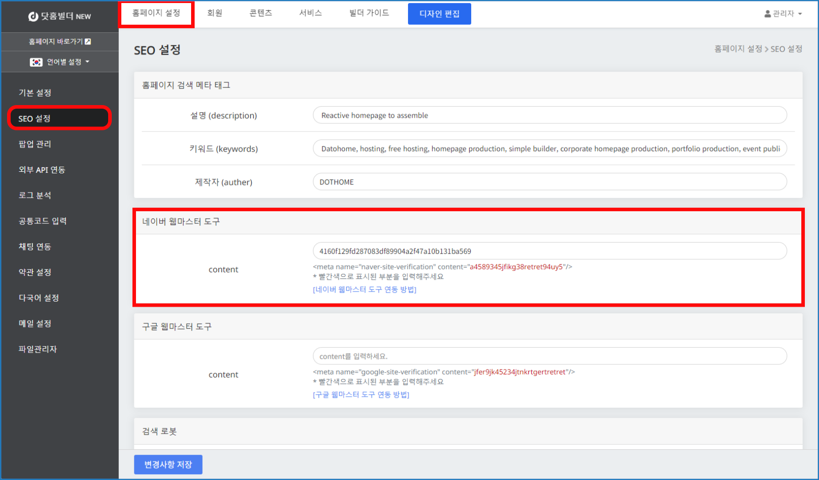 닷홈 빌더 관리자의 [홈페이지 설정]-[SEO 설정]-네이버 웹마스터 도구 content 입력란에 복사한 코드를 붙여 넣은 후,[변경사항 저장]을 눌러 적용합니다.