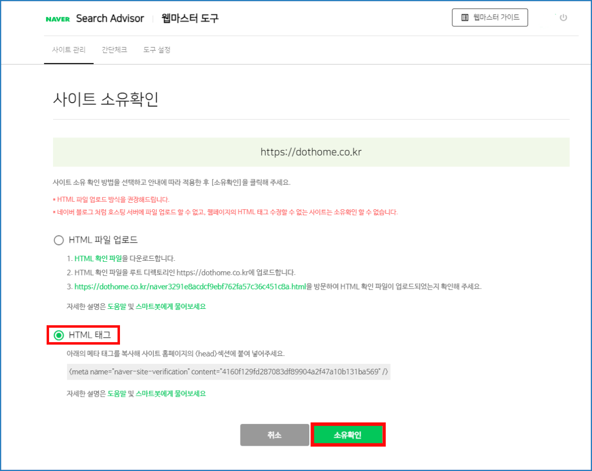 확인 방법으로, HTML 메타 태그를 선택한 뒤, 제공하는 메타태그를 복사하여,