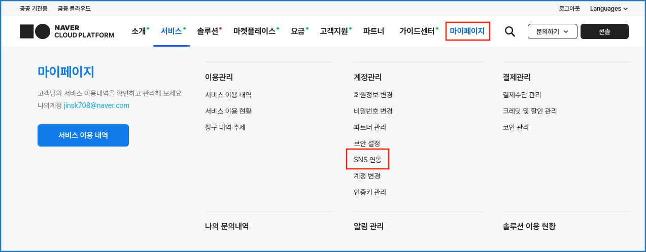 네이버 클라우드 플랫폼 사이트로 이동하여 로그인 또는 가입 후, 로그인하여 마이페이지 > SNS 연동을 클릭하여 계정을 연동합니다.
