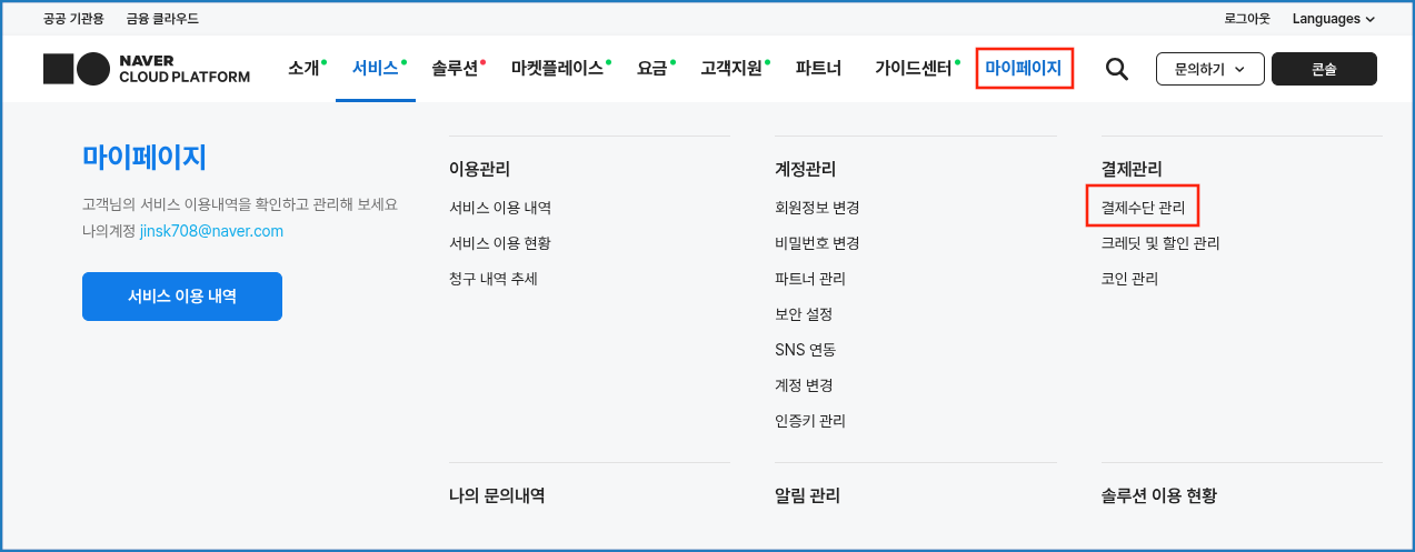 [네이버 클라우드 플랫폼 결제수단 관리 메뉴]