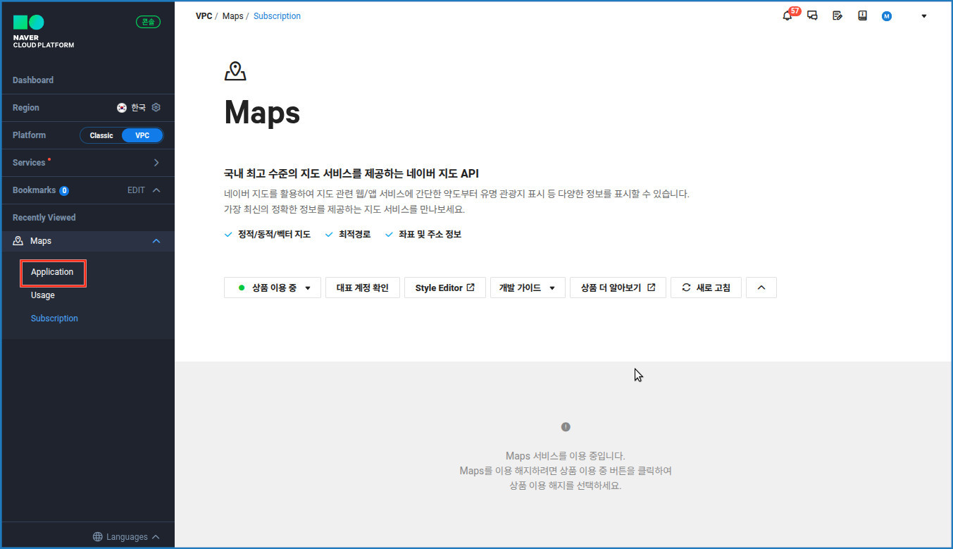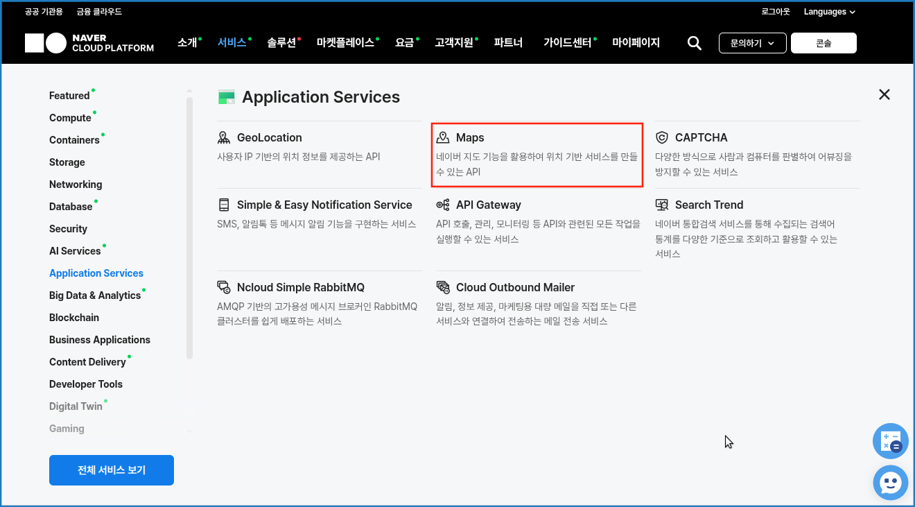상단 메뉴에서 서비스 > Application Service > Maps를 선택합니다.