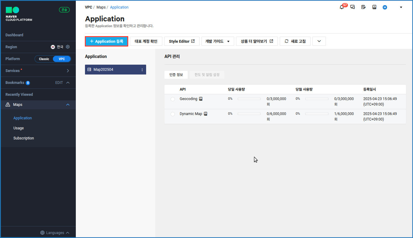 좌측메뉴 Maps 아래의 Application을 눌러줍니다.