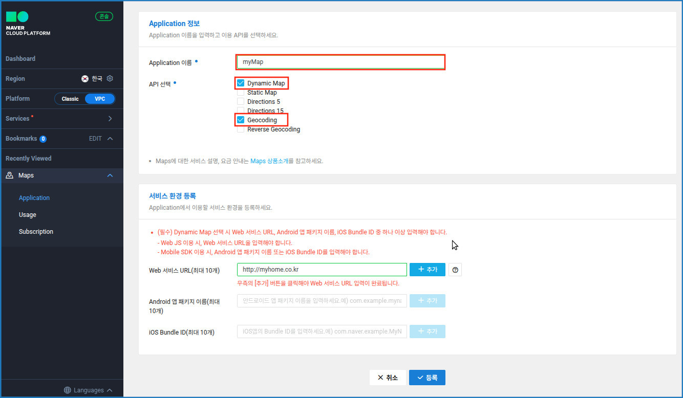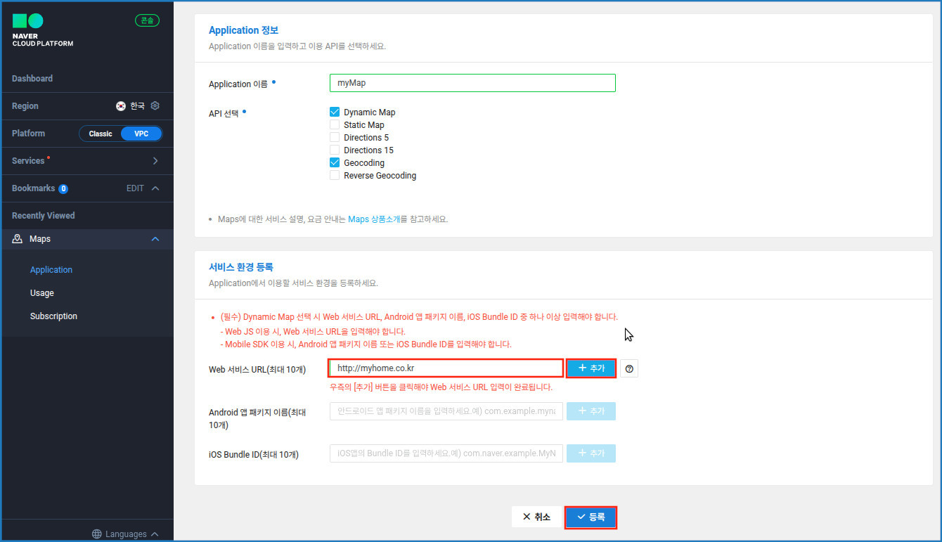 [네이버 클라우드 플랫폼 Maps API 등록 화면]