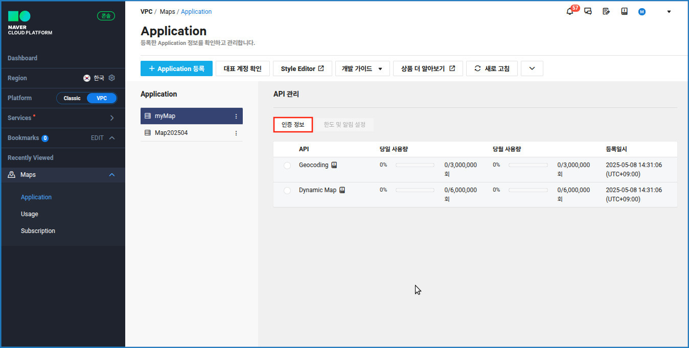 [네이버 클라우드 플랫폼 Maps API 인증 정보 버튼]
