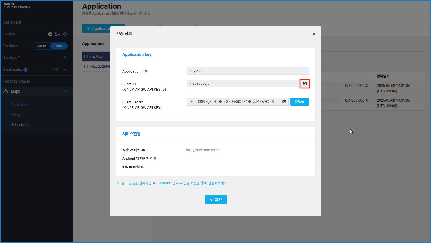 [네이버 클라우드 플랫폼 Maps API 인증 정보 화면]