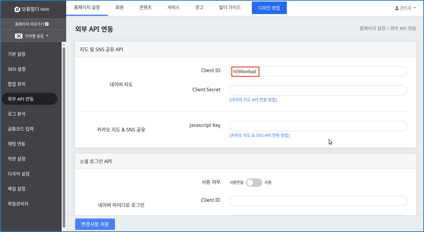 사이트 설정 > 외부 API 연동 > 네이버 지도의 Client ID에 복사했던 값을 붙여 넣어줍니다.