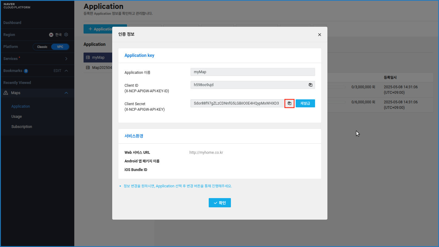 다시 네이버 클라우드 플랫폼으로 이동하여 Client Secret 값을 복사합니다.