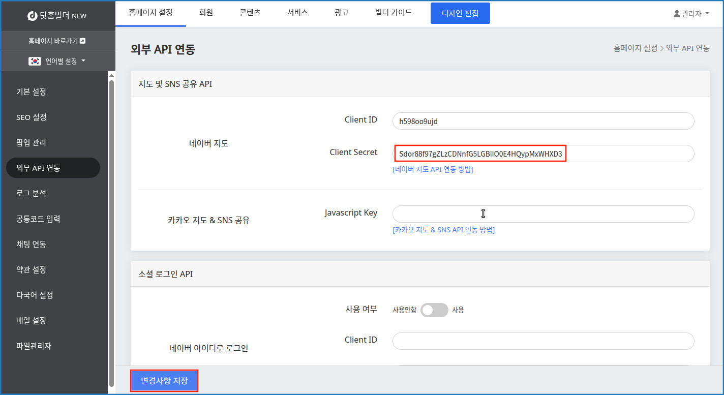 닷홈 빌더 관리자의 [홈페이지 설정]-[외부 API 연동] - 네이버 지도의 Client ID 와 Client Secret 에 복사했던 값들을 붙여 넣어줍니다.