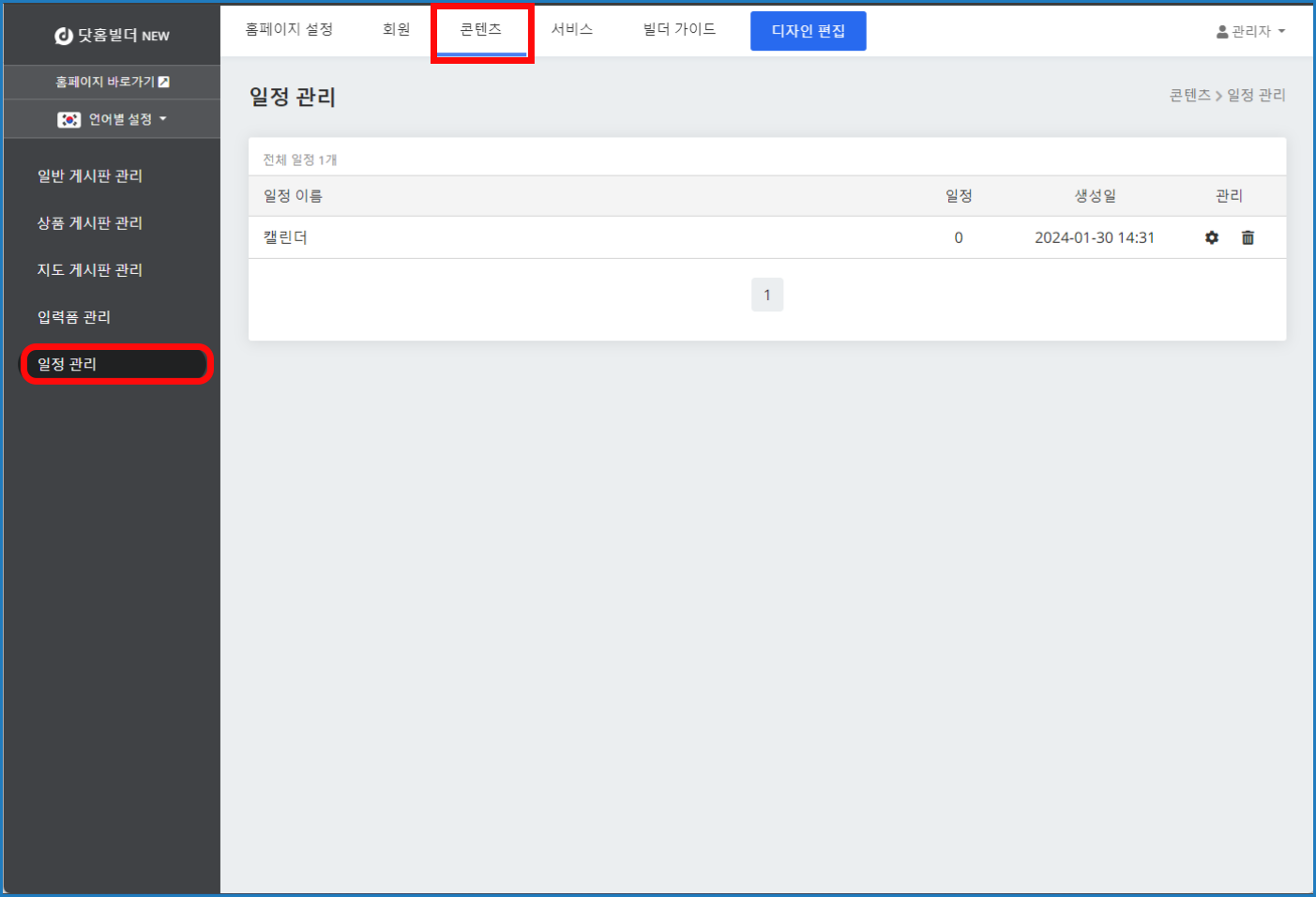 관리자 페이지 상단 메뉴의 [콘텐츠]를 클릭하시면 좌측에 게시판, 입력폼, 일정에 대한 메뉴들이 나옵니다.