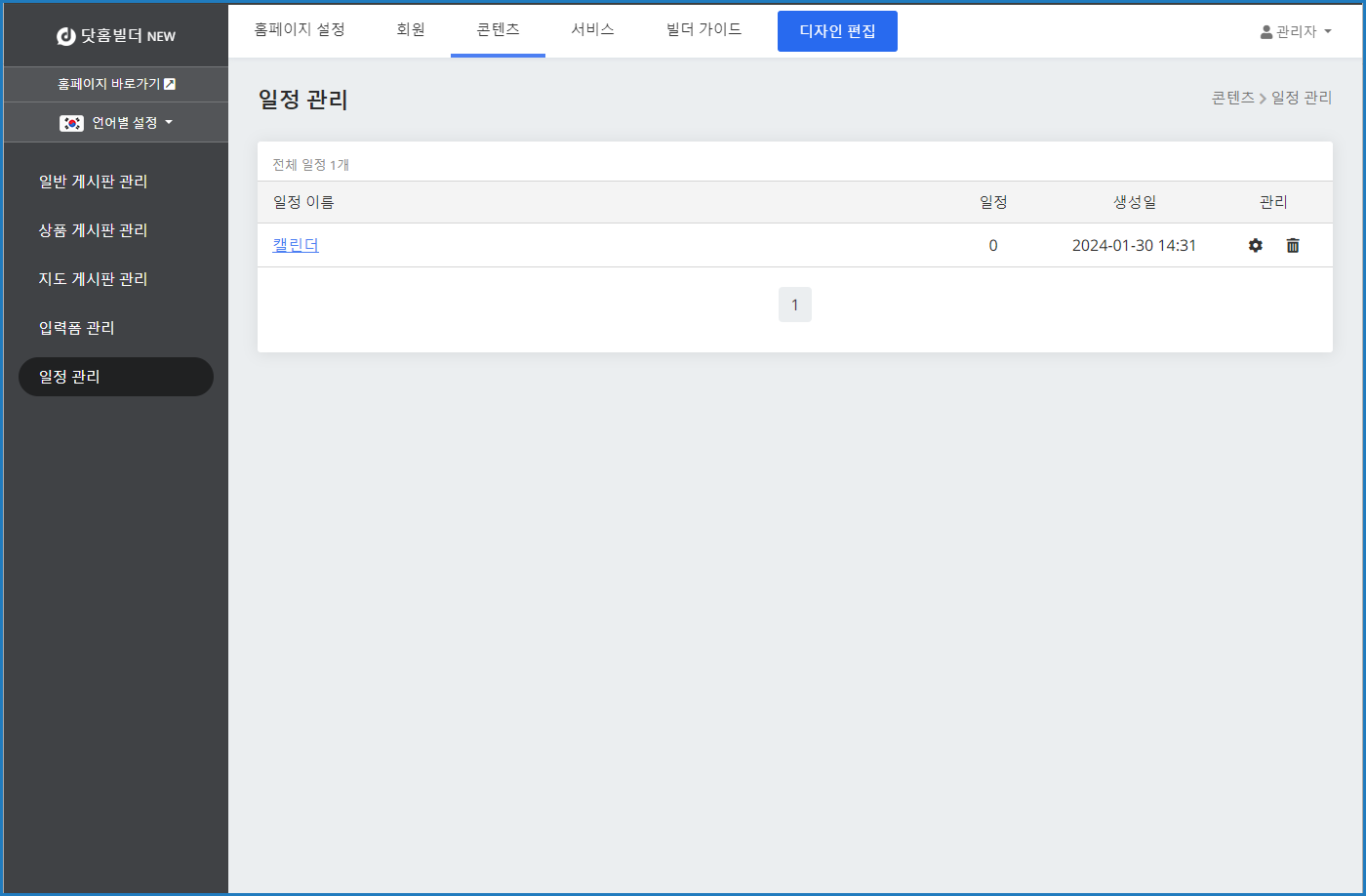 좌측 메뉴에서 [일정 관리]를 눌러 이동하시면 편집기를 통해 생성된 캘린더 목록을 확인할 수 있습니다.