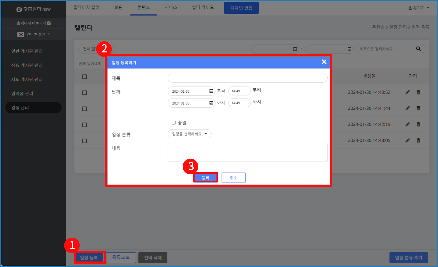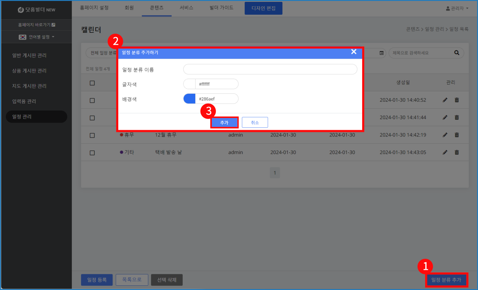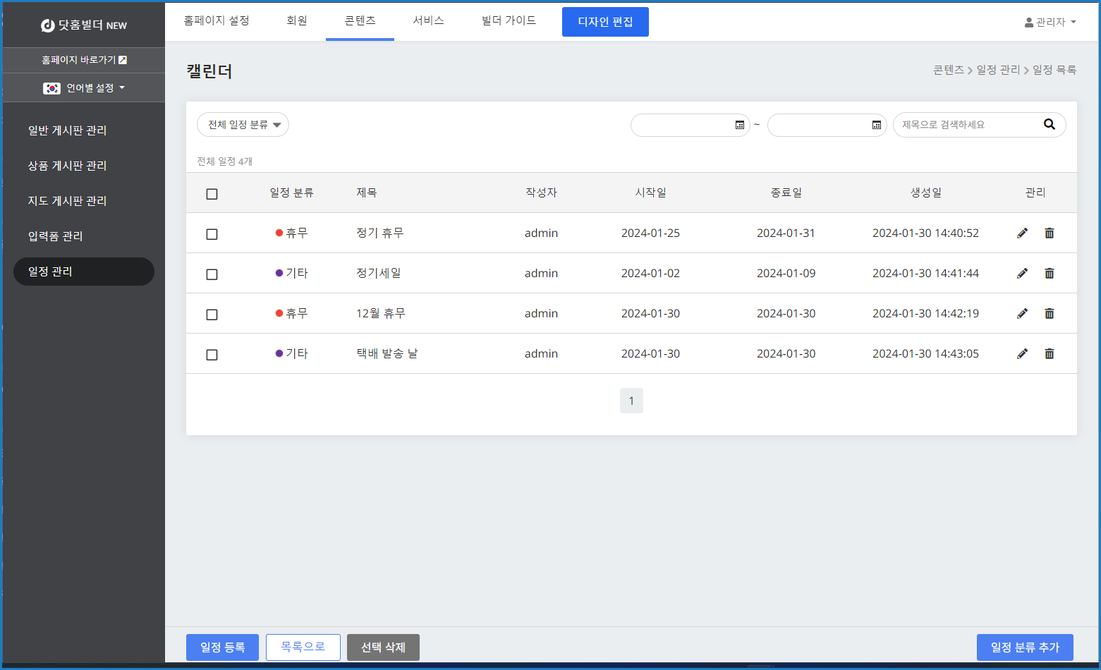 관리자페이지에서 닷홈빌더 자체 캘린더의 컨텐츠를 관리할 수 있습니다.