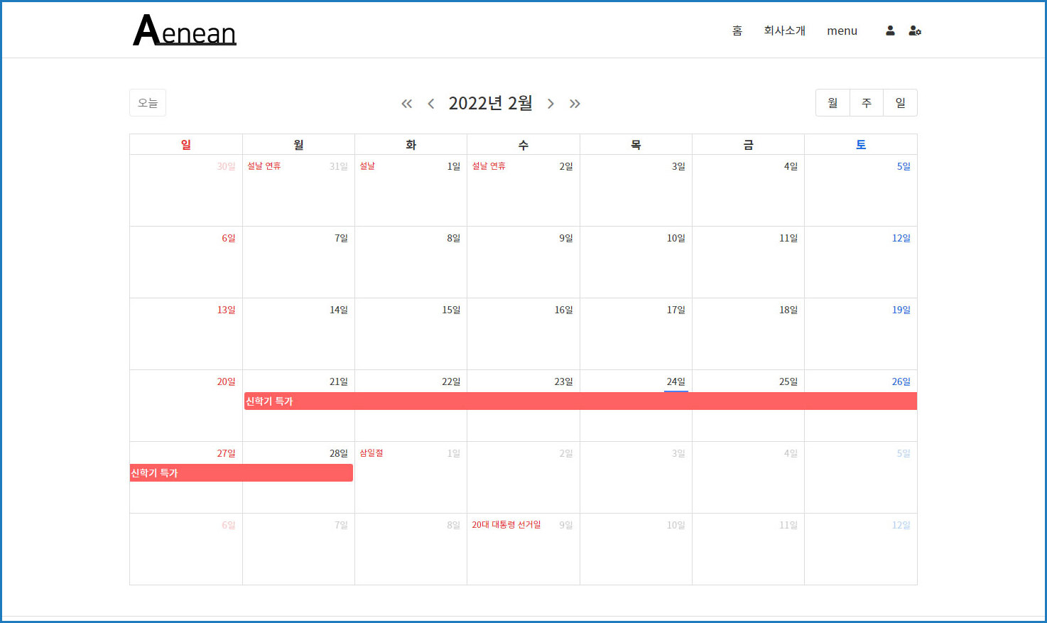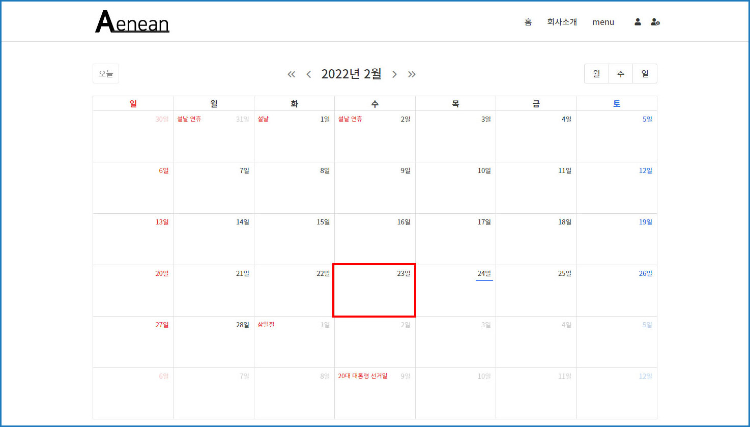 실제 페이지에서는 관리 페이지와 다르게 달력 위에 일정이 표시됩니다.