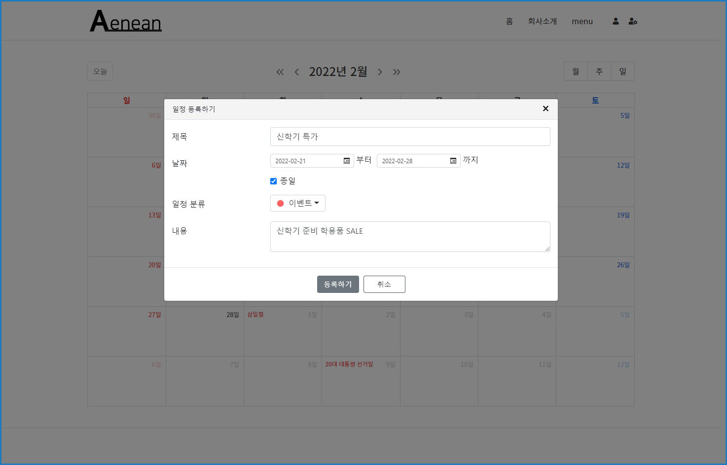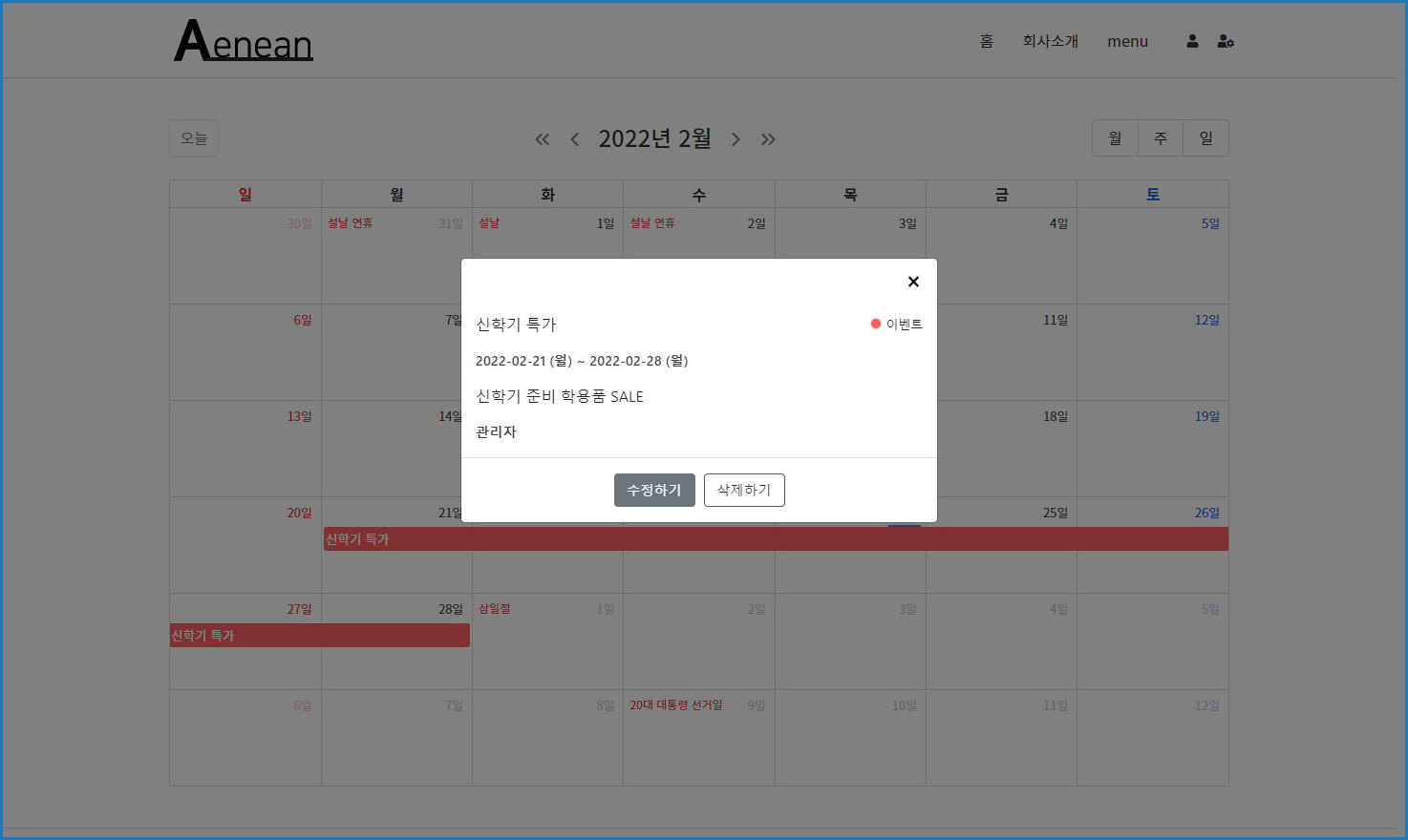 관리페이지 뿐만 아니라 캘린더가 적용되어 있는 페이지에서도 일정을 추가/수정/삭제할 수 있습니다.