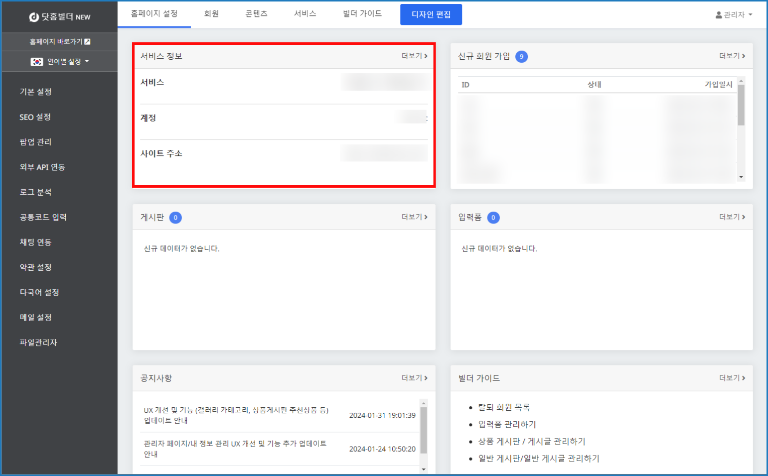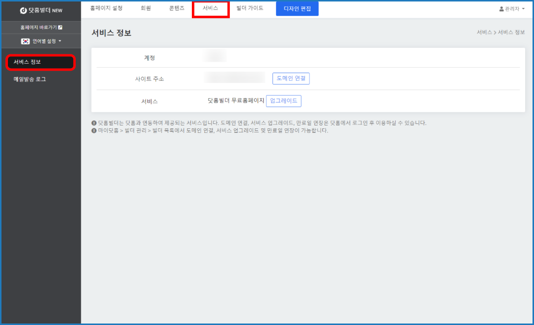 [닷홈빌더 관리자 서비스 정보 페이지]