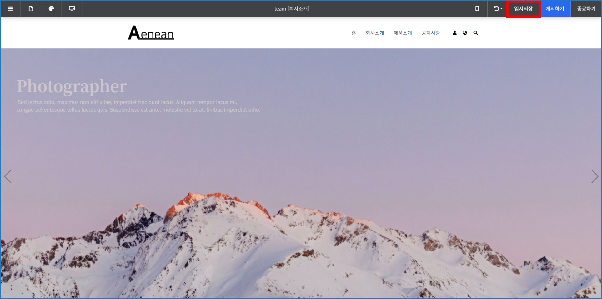 상단 메뉴의 [임시저장]을 누르면 해당 시점의 페이지 내용이 저장됩니다.