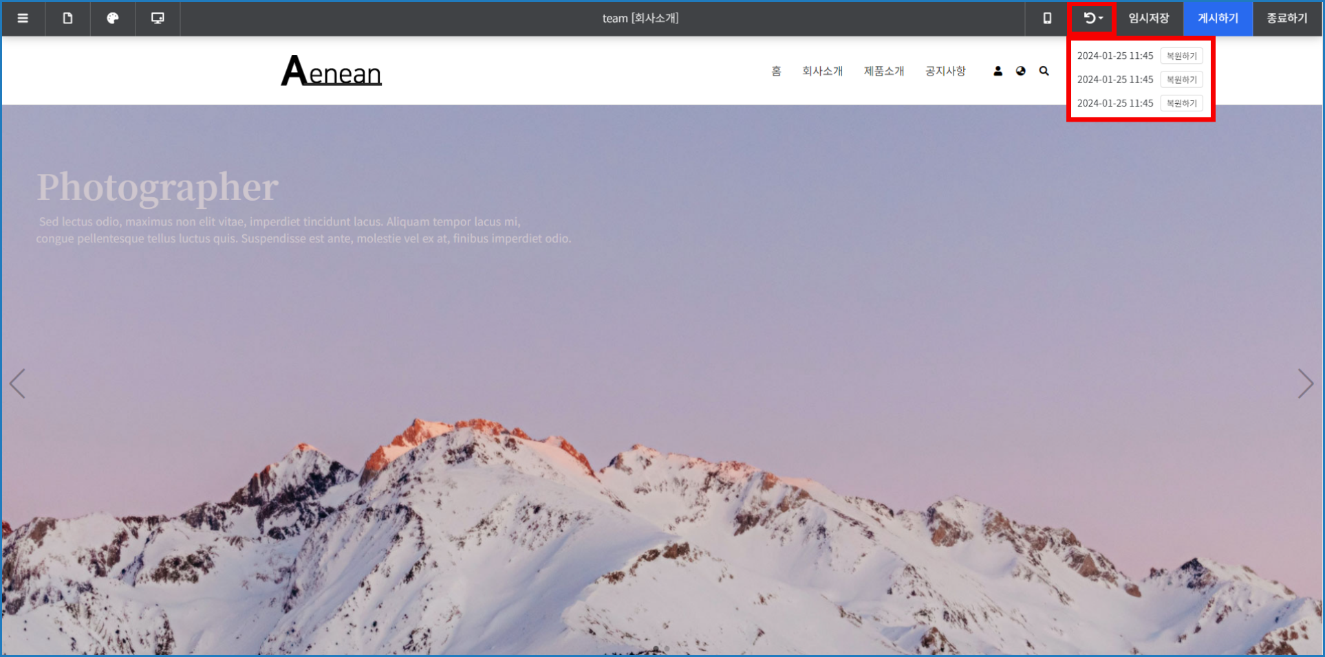 복원하기를 원하는 시점의 [복원하기] 버튼을 클릭하시면 현재 페이지 내용이 해당 복원 시점으로 페이지 상태로 돌아갑니다.