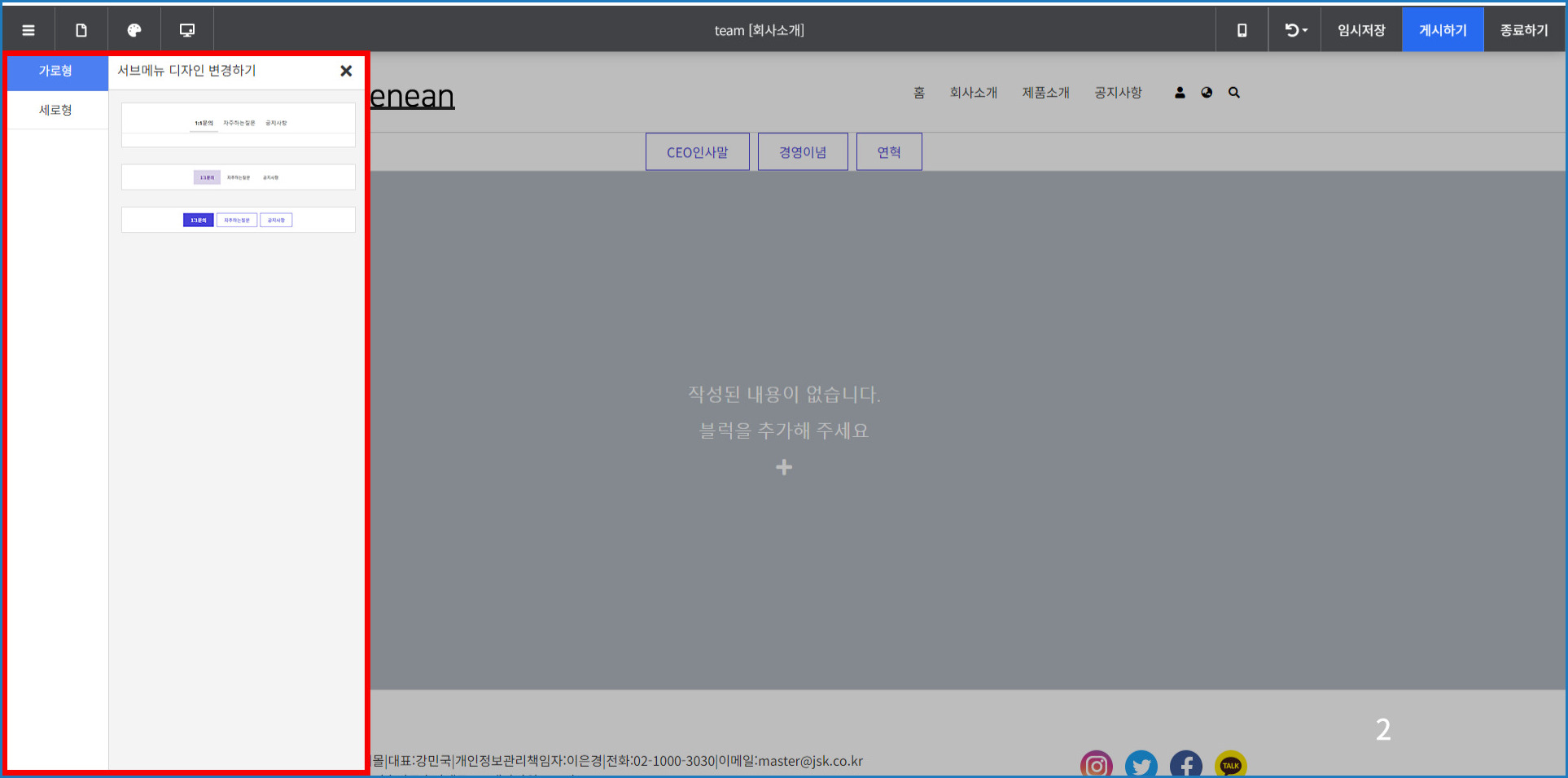 서브 메뉴의 디자인도 변경이 가능하면 가로형 섭스 메뉴, 세로형 서브 메뉴를 제공하고 있습니다.