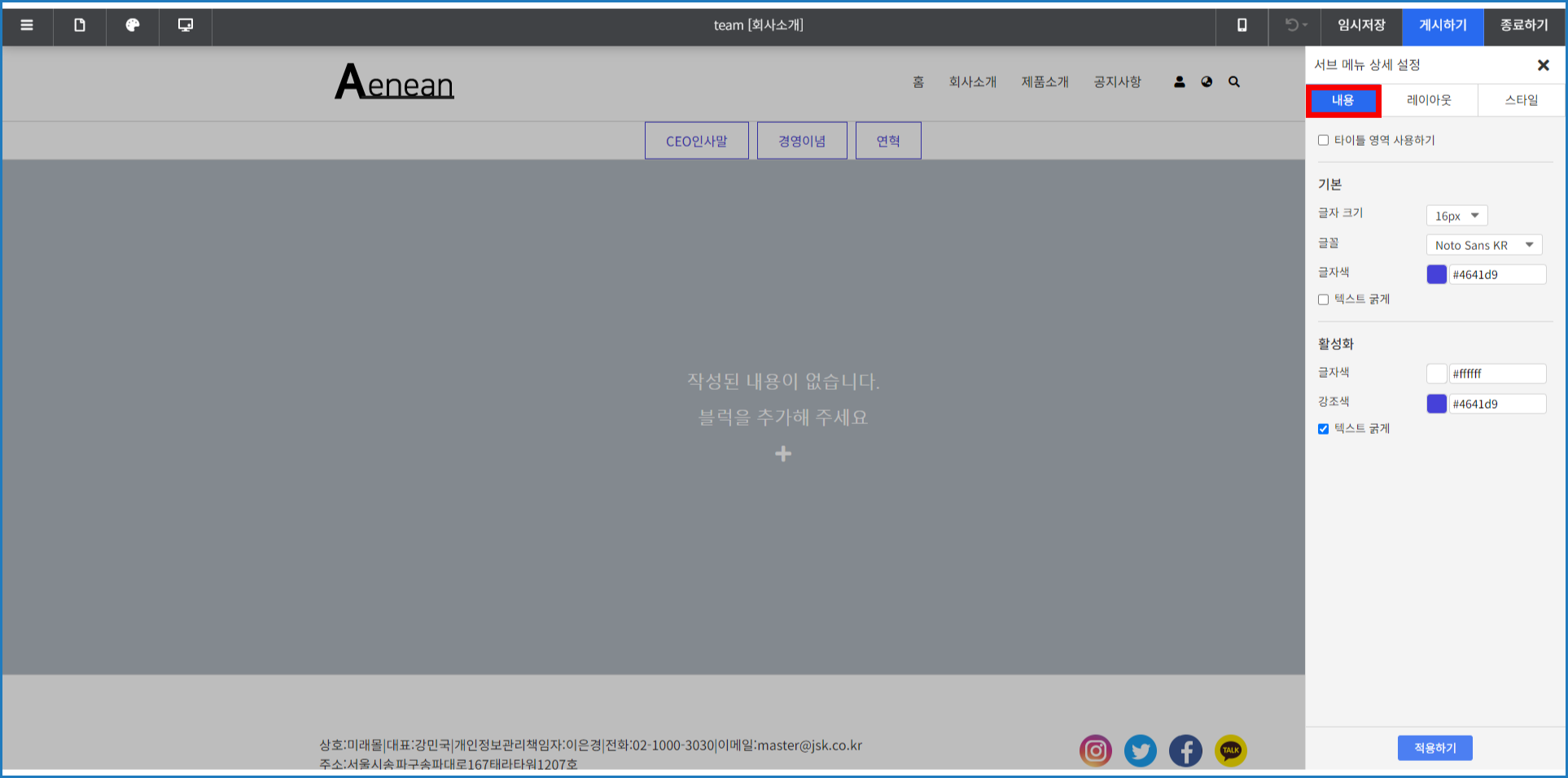 강조색 : 현재 페이지임을 표시하거나 마우스를 올렸을 때의 배경색이나 선 등의 색상을 설정합니다. 텍스트 굵게 : 현재 페이지임을 표시하거나 마우스를 올렸을 때의 글자 굵기를 설정합니다. |