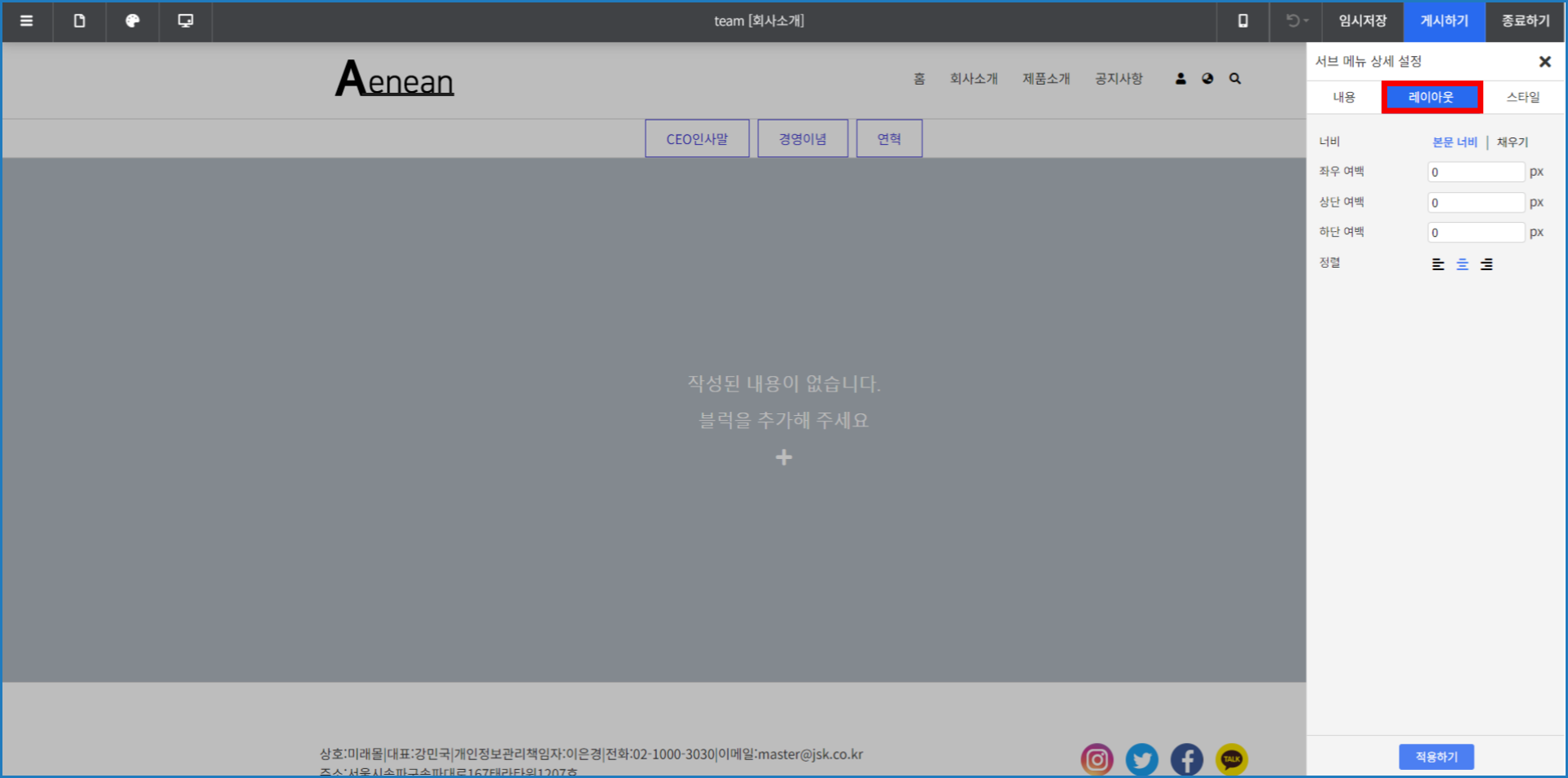 [디자인 편집] - 서브메뉴 영역의 [설정] 버튼을 클릭하면 서브 메뉴 상세 설정 창이 열립니다.